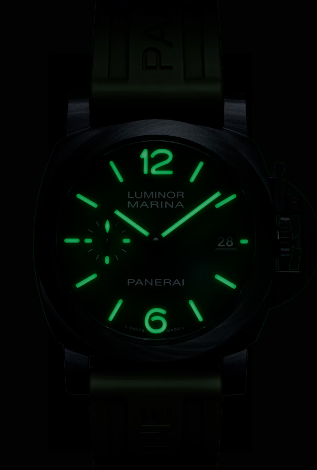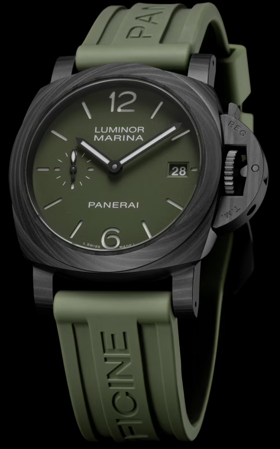Panerai Watch Luminor Quaranta Carbotech Green PAM01526. The Luminor case represents the essence of Panerai and a symbol of Italian design. Luminor is the collection characterized by the emblematic safety lock system