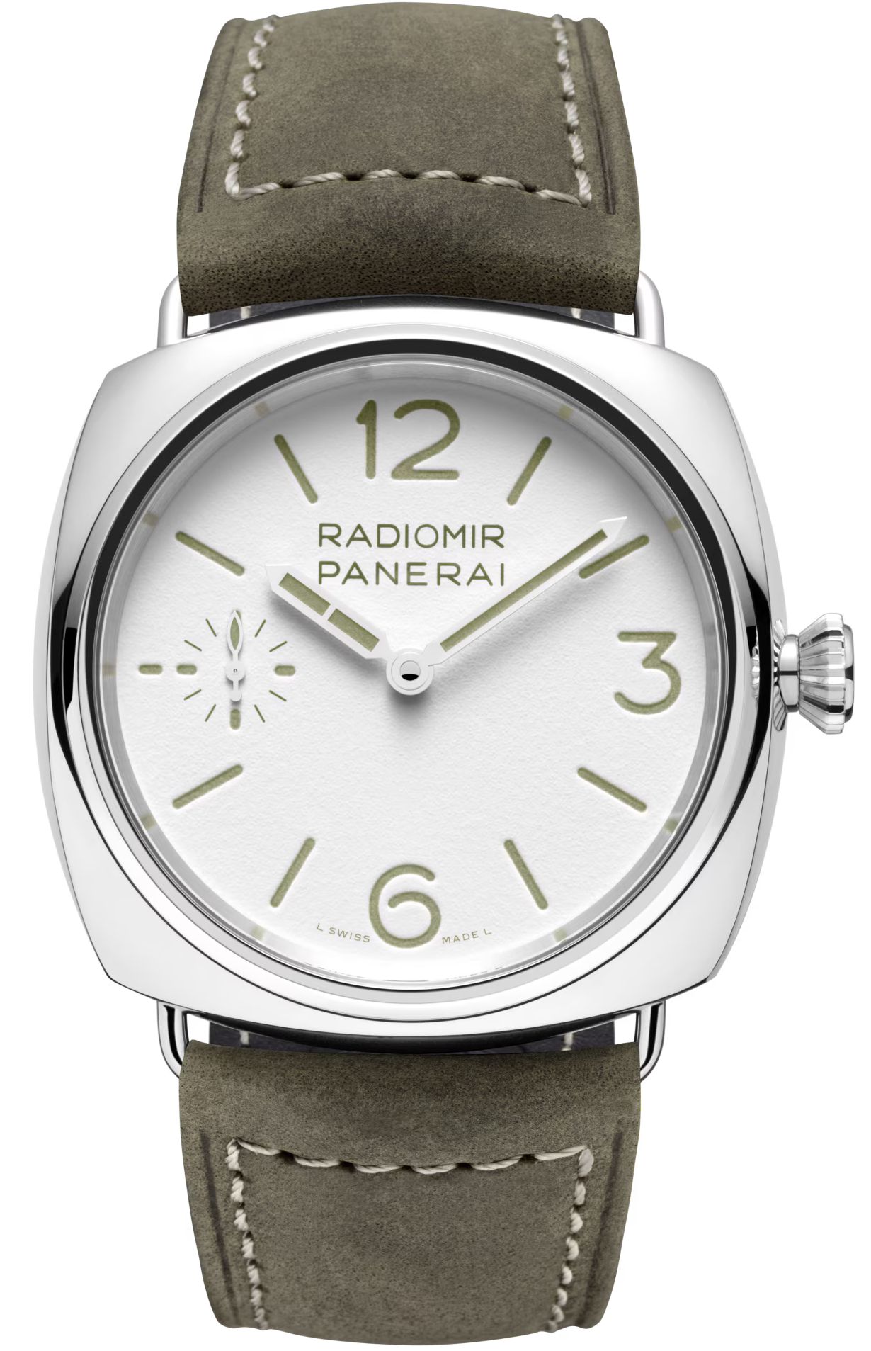 Packed with boundless helpings of retro charm and vintage character, this Panera Radiomir Officine watch retells the story of one of the world’s most iconic divers watches with this modern, Radiomir Officine watch reference PAM01384. The model, crafted from polished stainless steel, is integrated with a water resistant rating of 100 meters and features the collection’s distinctive onion shaped crown and cushion shaped case. The model presents the time on a white dial adorned with Arabic numerals at the cardinal points of the hour track. The remaining stick hours, treated with plenty of luminescent material, join the straight profile of the central hands to achieve legibility and clarity. A shot of colour is also afforded to the clean white dial in the hand of the small second sub counter.