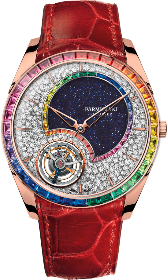 Parmigiani Fleurier Watch Tonda 1950 Double Rainbow Tourbillon PFH279-1064600-HA2121. Parmigiani Fleurier is proud to present its new creation: the Tonda 1950 Tourbillon Double Rainbow. This haute horlogerie timepiece, driven by the ultra thin PF517 movement, features a double gradient of extraordinary colours and represents a fine example of Parmigiani Fleurier's skill in marrying the arts of watchmaking and jewellery.