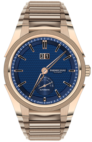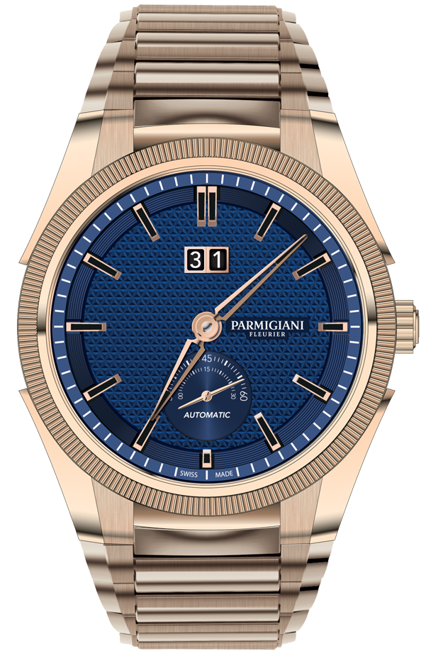Parmigiani Fleurier Watch Tonda GT Rose Gold Blue Bracelet PFC910-1500340-B00782. The beauty of the guilloche decoration shines through on these dials, which have a big date aperture at 12 o clock and a small seconds subdial at 6 o clock. They easily transform into a sportier watch when paired with a rubber strap, allowing todays man to easily transition from a day full of activities to an elegant evening.