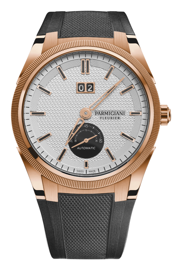 Parmigiani Fleurier Watch Tonda GT Rose Gold PFC910-1500140-X01482. The beauty of the guilloche decoration shines through on these dials, which have a big date aperture at 12 o clock and a small seconds subdial at 6 o clock. They easily transform into a sportier watch when paired with a rubber strap, allowing todays man to easily transition from a day full of activities to an elegant evening.