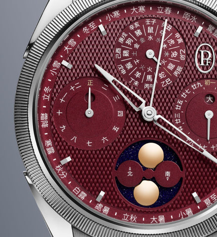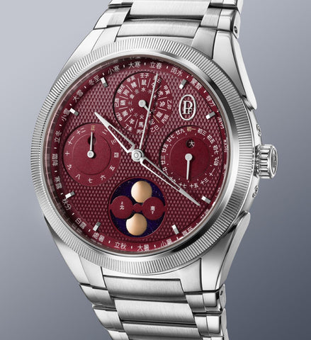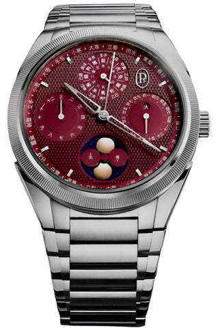 The Parmigiani Fleurier Tonda PF Xiali Chinese Calendar watch reference PFH982-1022501-100182 honours cultural diversity and embraces the brand’s unwavering commitment to superb design with the first watch that displays the entire Chinese calendar on one single dial. As such, it provides the 24 solar terms, the zodiac animals, the lunar phases, the 10 heavenly stems, and the 12 earthly branches. All of these unique features are set against a guilloche backdrop in maroon red. This version of the world famous Tonda PF watch is crafted from stainless steel and still keeps the knurled bezel, crafted from 950 platinum, as well as an integrated bracelet of the original series.