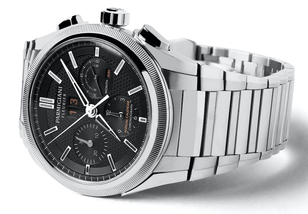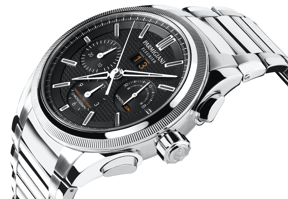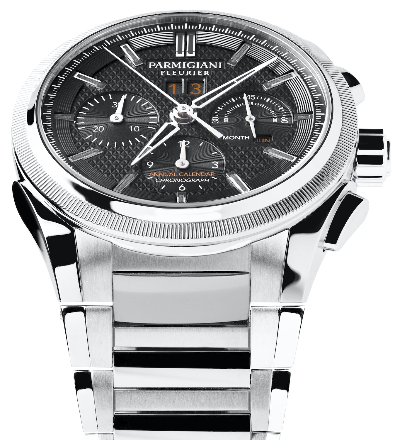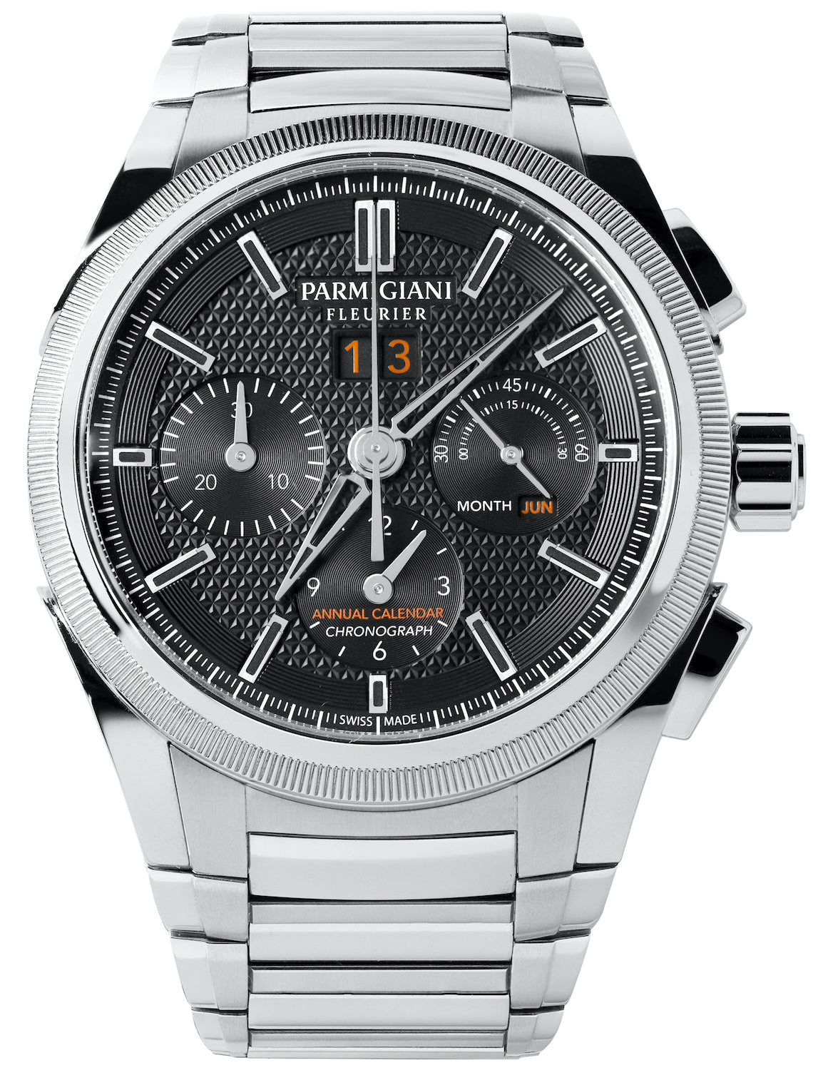 Parmigiani Fleurier Watch Tondagraph GT Acier Limited Edition Steel Bracelet PFC906-0000210-B00182. The Tondagraph GT combines two of watchmakings most useful complications- an annual calendar and a chronograph. This is uncommon, and once again Parmigiani Fleurier fills a void in the watchmaking world by presenting them together at a level of quality seldom rivaled, and yet, with an exceptional price. To draw attention to the annual calendar function, the date and month are displayed in a vibrant orange color.