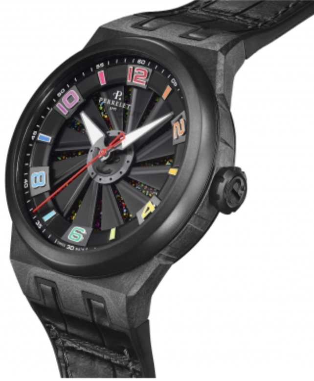 Perrelet Watch Turbine Carbon Rainbow 3 Hands Limited Edition A8003/1. "Turbine Rainbow" features a high-tech case with a stainless steel bezel and case back with matte black PVD coating and a central body made of polycarbonate and carbon fibre. The properties of carbon fibre include its thermal insulation capacity, its resistance to chemical agents and temperature changes, and its extreme lightness; qualities that make it an ideal material for watchmaking.