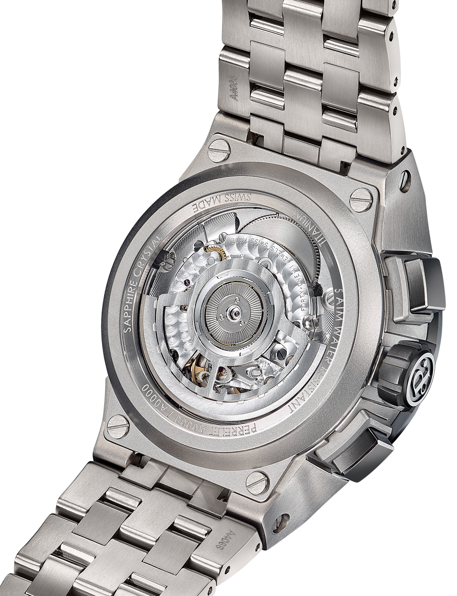 Perrelet Watch Turbine Chrono NEO Blue A4072/1. The Turbine Chrono NEO enhances precision with an instantly readable chronograph, replacing traditional secondary counters. Updated with modern materials, a smaller diameter, a central chrono minute hand, and timeless color variations. The NEO version also brings out a much more wearable material with a titanium case and bracelet, easily swapped for a rubber strap without tools. This evolution showcases Perrelet’s commitment to innovation while honoring its Swiss watchmaking heritage.