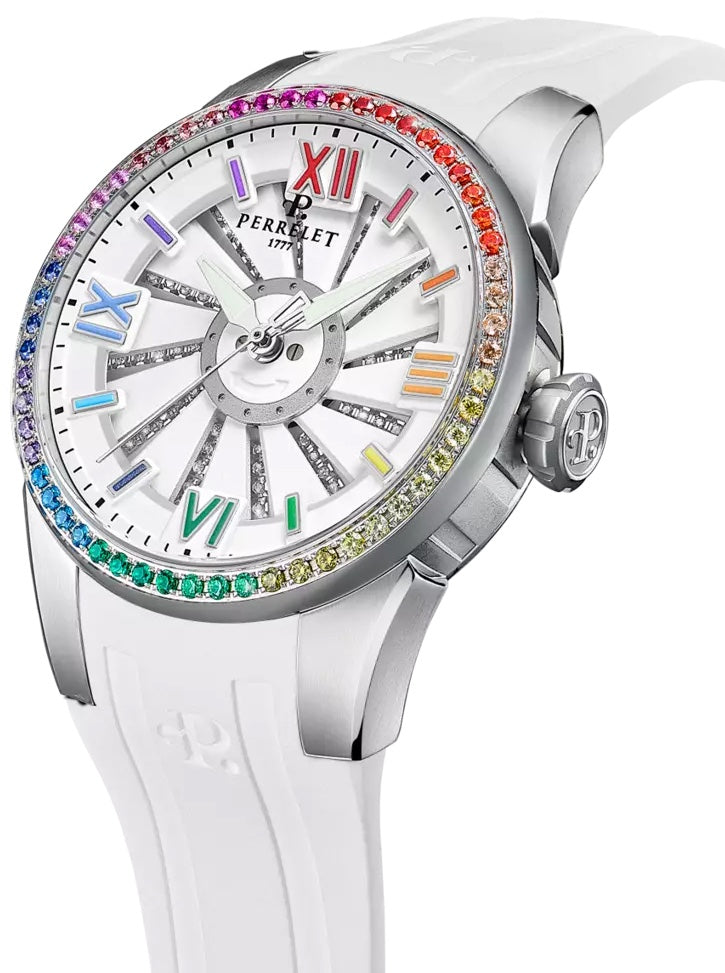 Perrelet Watch Turbine Lady Aurora A4069/7. The Turbine Lady Aurora is a vibrant and colourful masterpiece that celebrates creativity and unique style. Its bezel set with 56 multi coloured zircons arranged in a rainbow pattern captivates with its brilliance. The rainbow hued turbine reveals a dial background decorated with diamonds, creating a spectacular play of light. The hour markers and hands share the chromatic palette, accentuating the harmony of the design. Available with a rubber strap or steel bracelet, this model is ideal for women looking to stand out with a bold and exquisitely feminine timepiece.