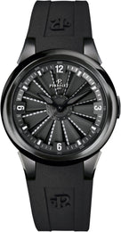 The 41mm stainless steel and black PVD case of this Perrelet Turbine XS watch embraces the P-331 automatic movement that was made completely in house by the brand. The striking black turbine rotor defines the model and spins captivatingly over an unmissable 0.36 carat diamond set under dial while the Arabic numerals and propeller styled hands are decorated in a matching black paint. To complete the watch, a black rubber strap is added alongside a matching stainless steel and black PVD buckle.