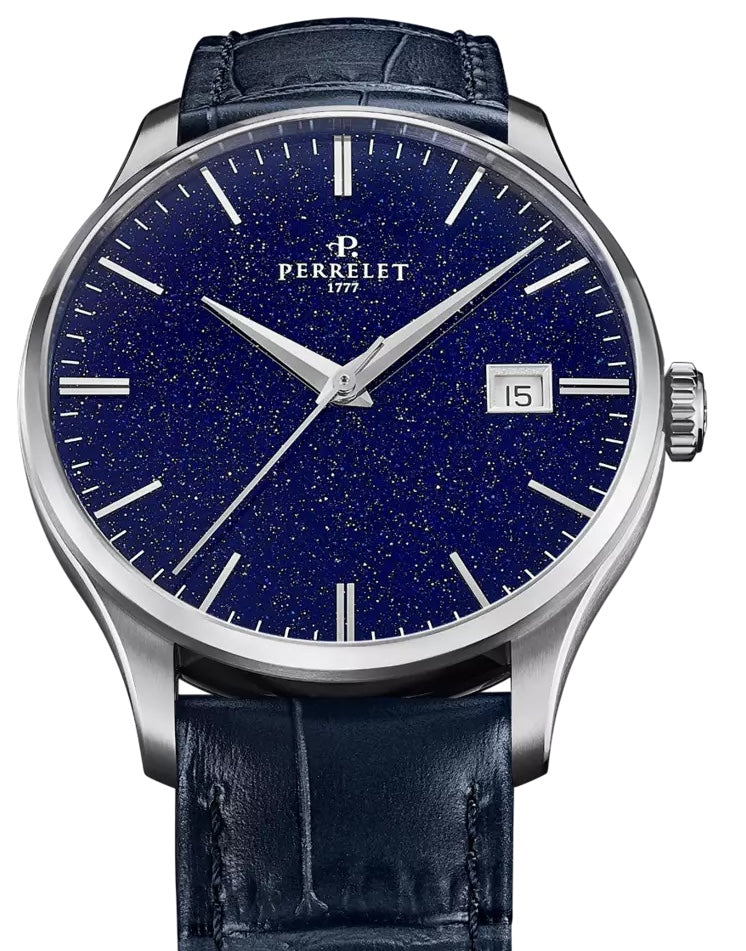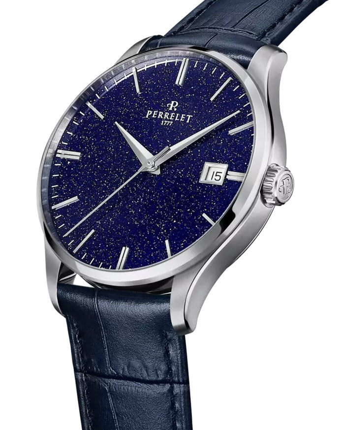 Perrelet Weekend Adventurine Watch A1300/H. Perrelet presents the WEEKEND AVENTURINE A1300/H, a refined addition to its classic collection. This model stands out for its aventurine blue dial, a natural material that reflects light like a starry night sky, adding a unique and sophisticated brilliance.