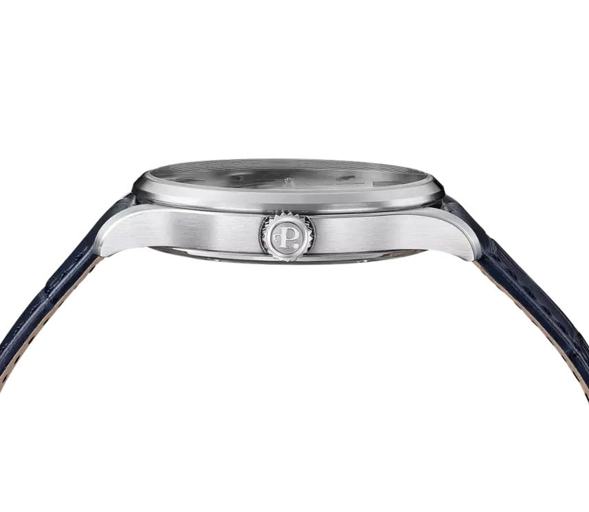 Its 39 mm stainless steel case houses the in-house automatic calibre P-321, visible through the transparent case back. With a minimalist and elegant aesthetic, the watch features dauphine hands, applied silver indices, and a date window at 3 o’clock. The midnight blue calf leather strap with alligator pattern completes this unisex timepiece—perfect for those who value the understated charm of Swiss watchmaking with a poetic touch.