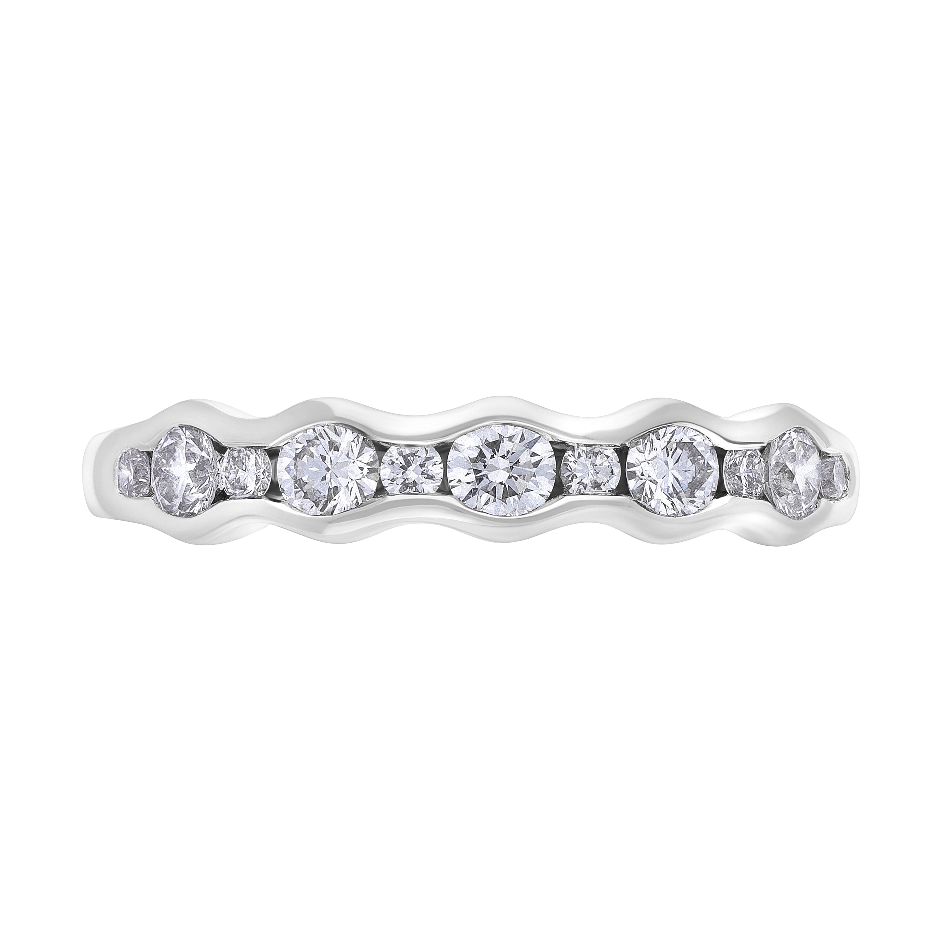 This classic yet contemporary half eternity ring features alternating sized diamonds which total to 0.51ct, is channel set in platinum, beautifully accentuating the sparkle within the stones. The platinum band has a subtle wave design, giving this precious gemstone and diamond set ring a unique design.