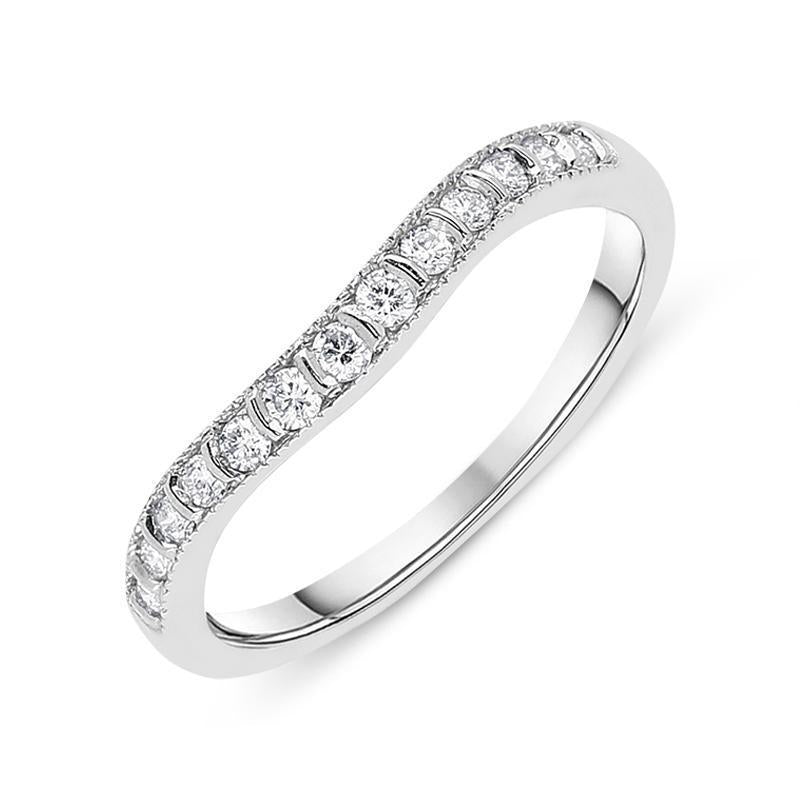 This stunning diamond eternity with a classic wishbone design, houses round brilliant cut diamonds bar set with a total diamond weight of 0.18cts. The setting features a textured beaded style edge, and this design allows the ring to sit closer to certain styles of engagement ring and has been crafted in platinum. Designed perfectly for everyday wear, this statement ring has a substantial solid platinum band and would make the perfect eternity or dress ring to sit comfortably alongside other bands.