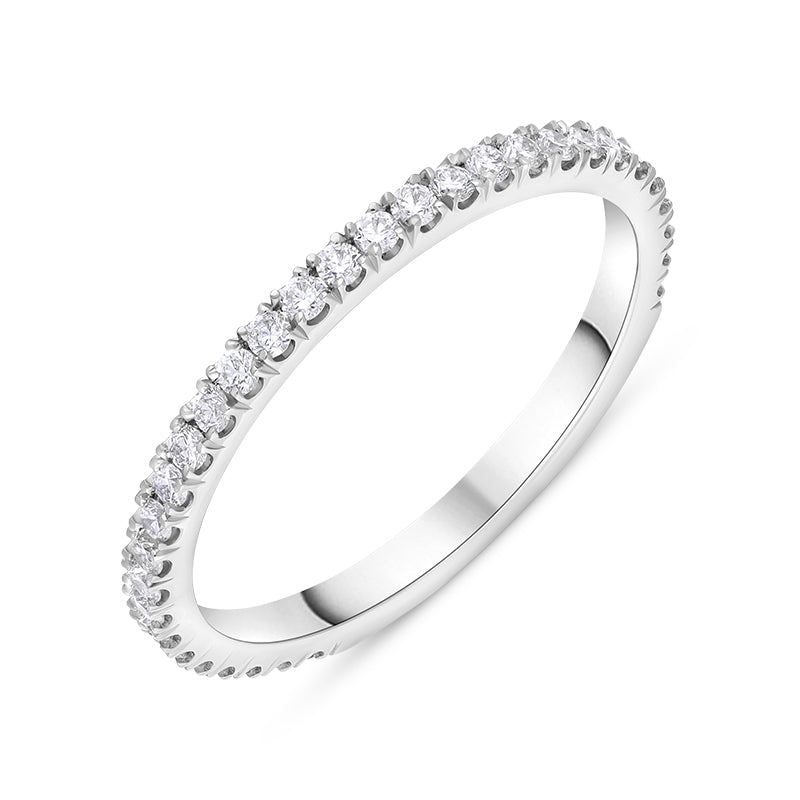 Classic and stylish, this stunning platinum quarter eternity ring is set with 0.30cts of sparkling brilliant cut diamonds, which are claw set into the band to allow the maximum amount of light to flow through the stones. The slim design of the ring means that this piece can be worn comfortably alongside other rings and would be ideal as a wedding band or quarter eternity ring.