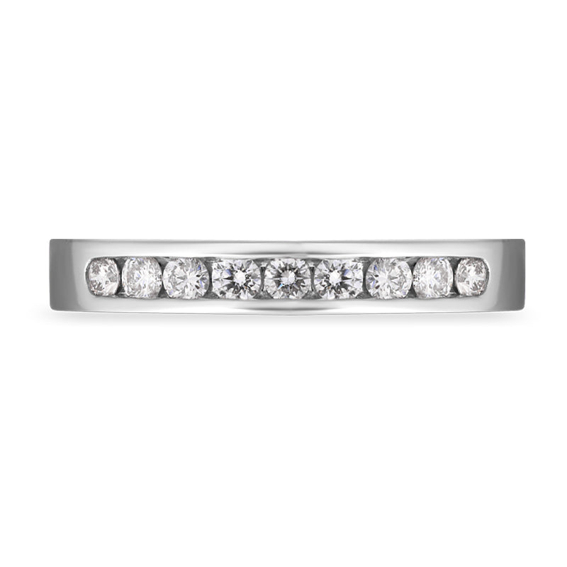 An embodiment of luxury and style, this breathtaking platinum half eternity ring is adorned with nine sparkling brilliant cut diamonds, totalling 0.30cts, which are neatly channel set. This stunning piece would make the perfect eternity or wedding band and the solid platinum band makes it perfect for every day wear.