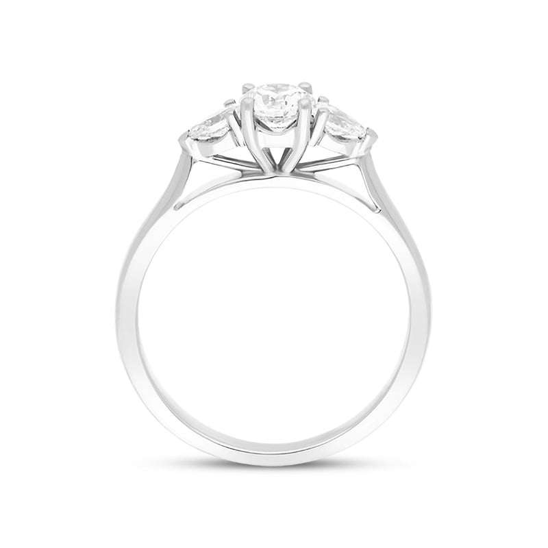This exquisite platinum ring features a round brilliant cut diamond at its heart, with a claw set pear cut diamond eitherside (Diamond 0.18ct, 0.28ct. 0.46ct total)