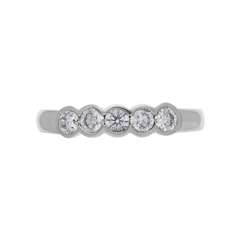 An embodiment of elegance of luxury, this stunning platinum ring features five sparkling brilliant cut diamonds, totalling 0.50cts, which are bezel set into the band. Designed perfectly for everyday wear, this diamond set piece would make the perfect wedding or eternity ring to sit comfortably alongside other bands.