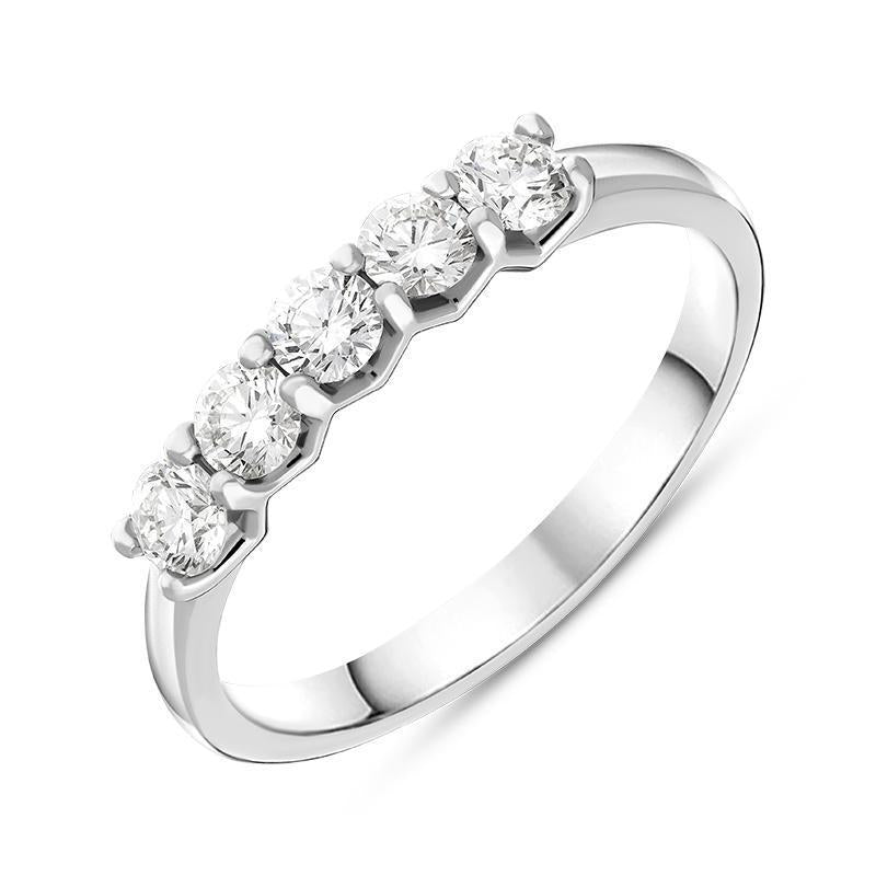 This stunning platinum ring features an array of five sparkling brilliant cut diamonds, totalling 0.54cts, which are securely claw set into the band, allowing the maximum amount of light to travel through the stones. The platinum band gives this beautiful ring a solid and substantial weight, making this a piece that will be treasured for generations to come.