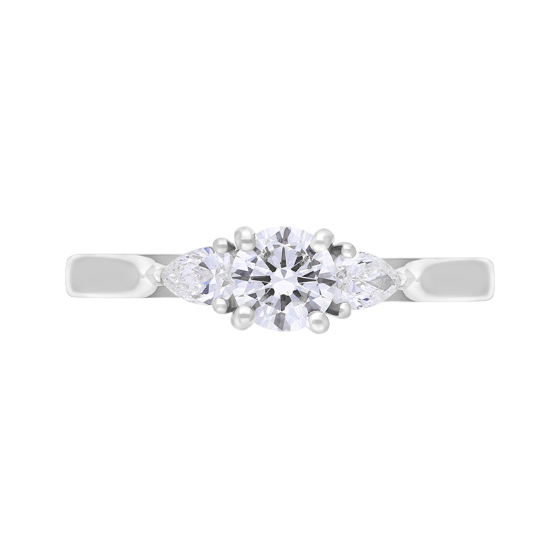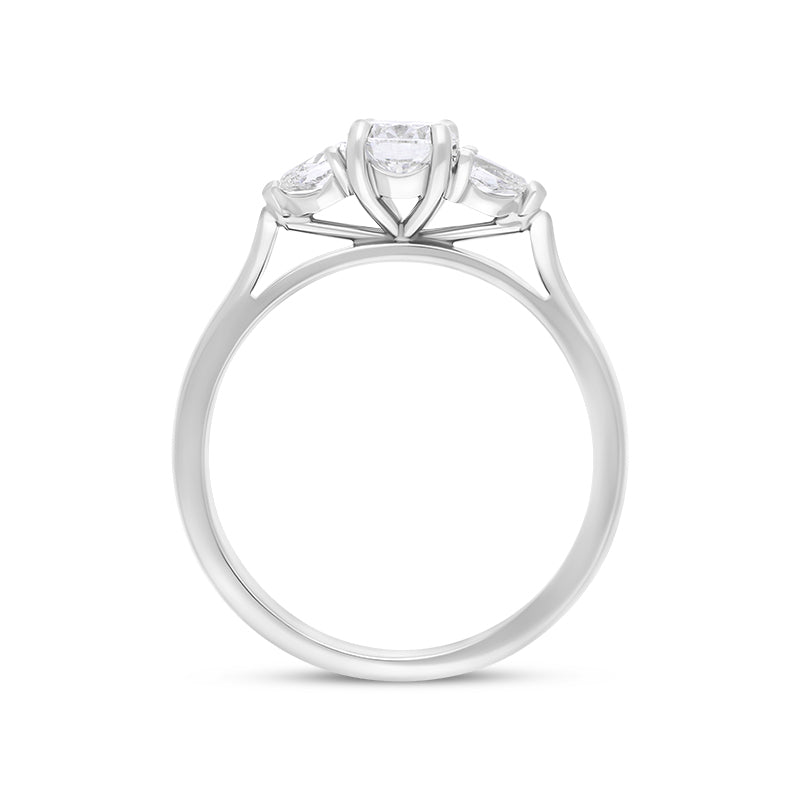 This stunning platinum three stone ring features a round cut diamond at its heart shouldered by pear cut diamonds (0.40ct, 0.22ct, 0.62ct total). The platinum band gives this beautiful ring a solid and substantial weight, making this a piece that will be treasured for generations to come.