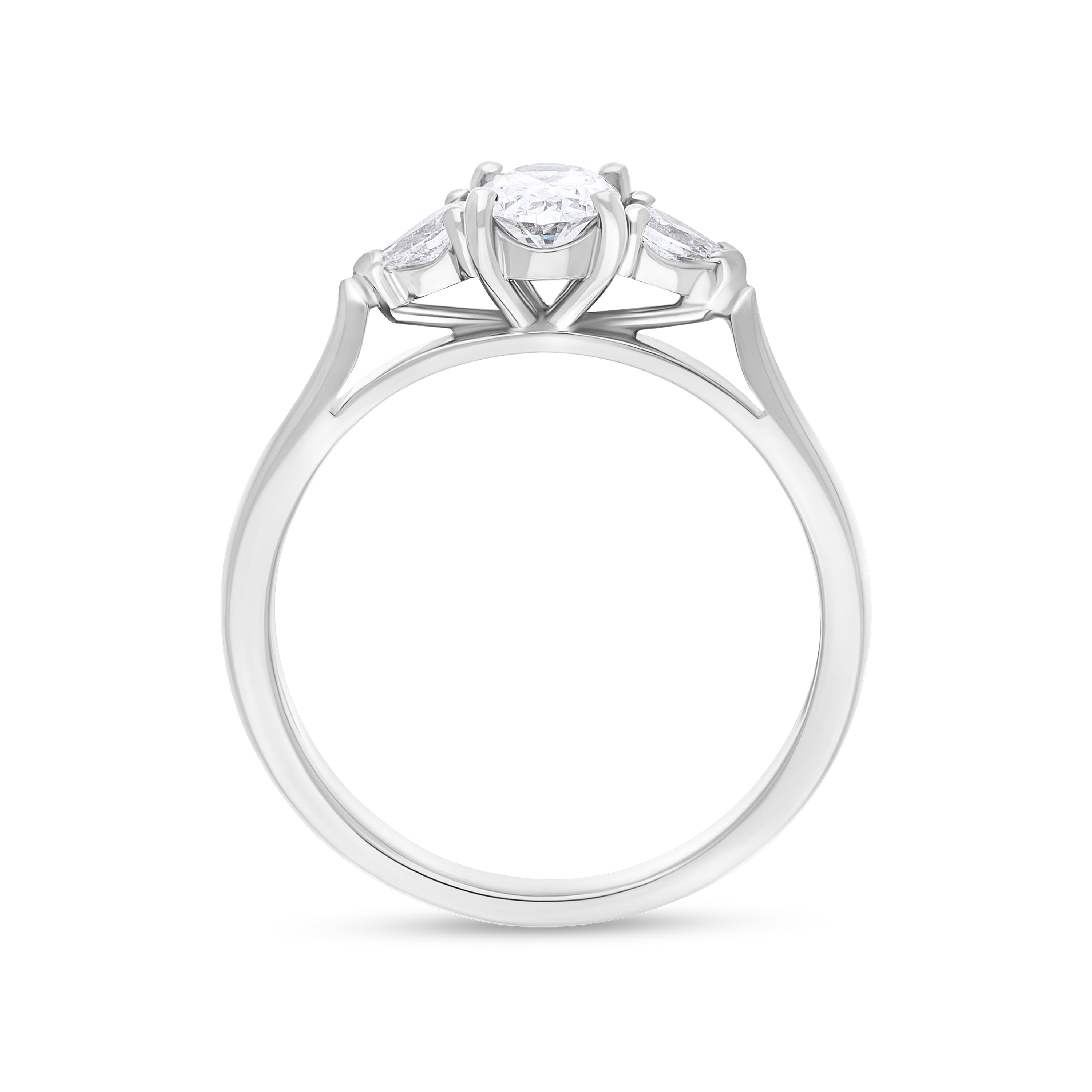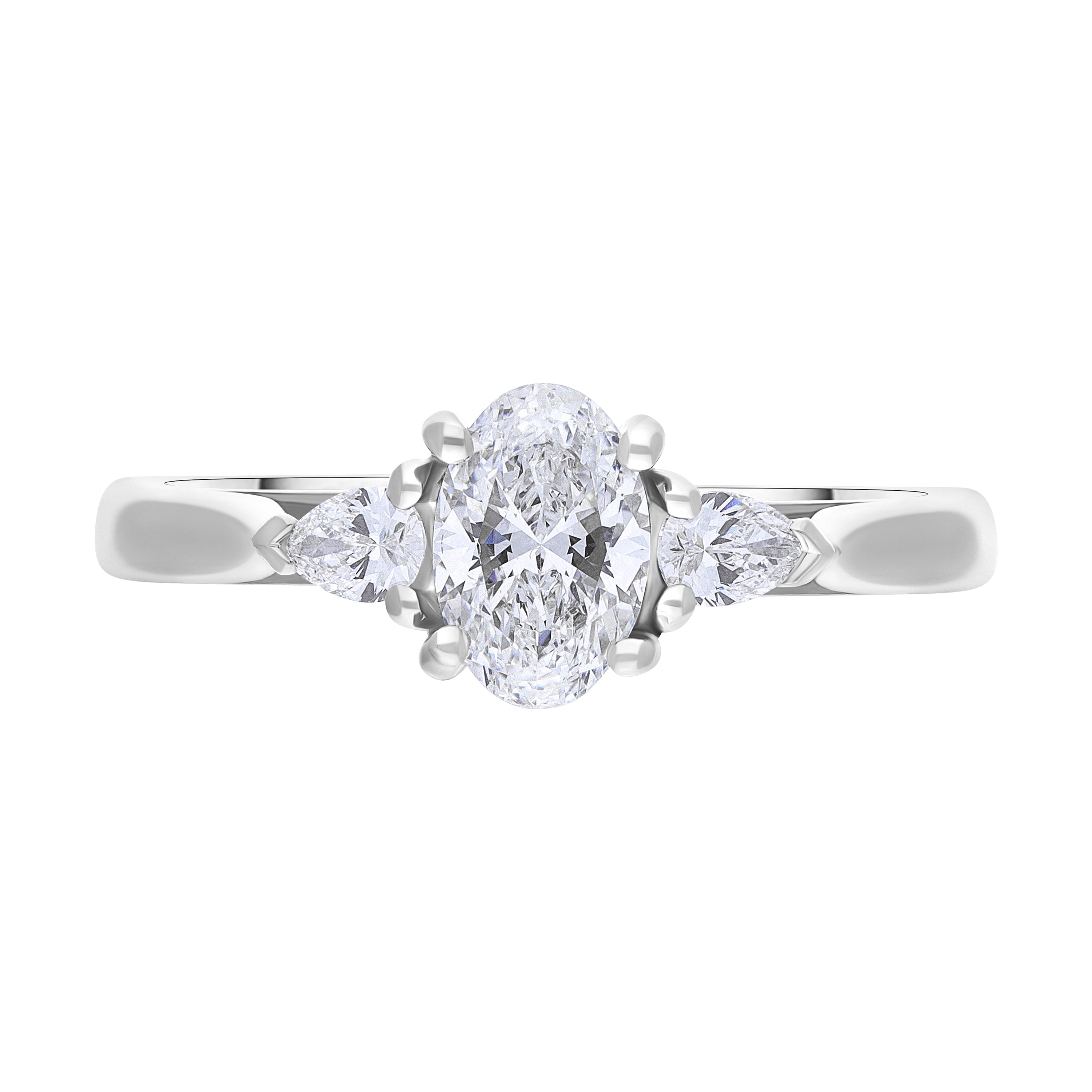 This stunning platinum ring features a central oval cut diamond of 0.51ct and the 2 outer pear cut diamonds totalling 0.14ct, completing the diamond weight of 0.68ct. The platinum band gives this beautiful ring a solid and substantial weight, making this a piece that will be treasured for generations to come.