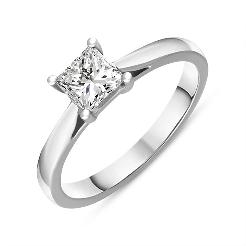 This classic platinum engagement ring features a stunning princess cut 0.70ct solitaire diamond. The beautiful diamond sits centre stage and is claw set on the substantial solid platinum band, allowing the maximum amount of light to enter the stone and therefore providing a dazzling display of light and colour.