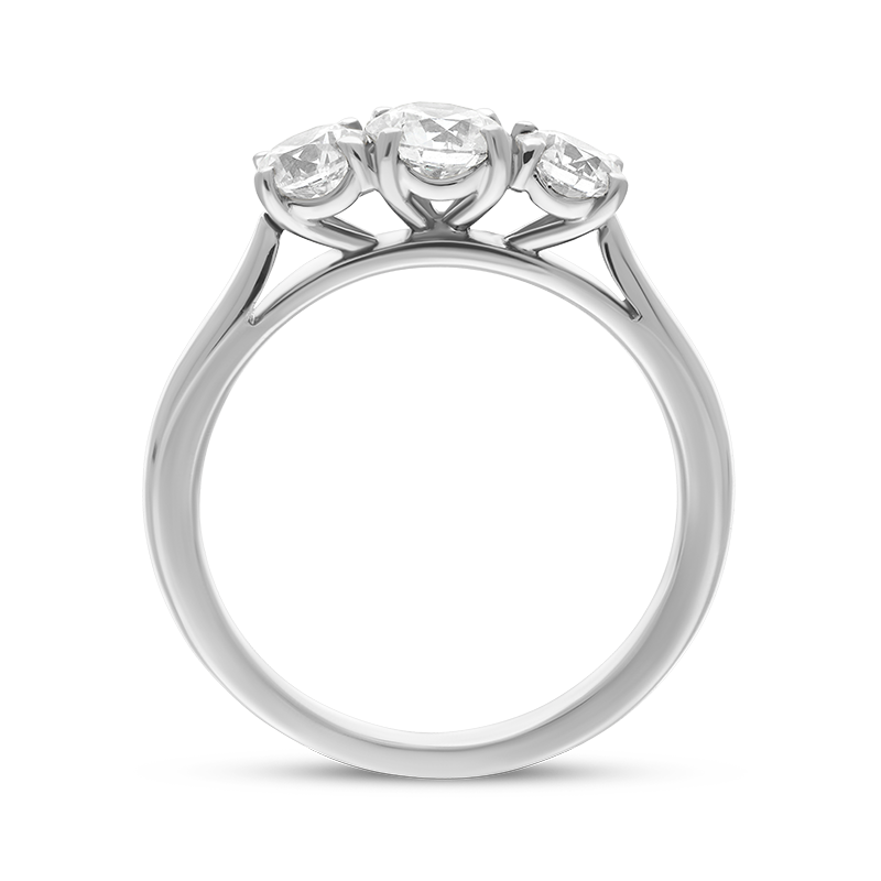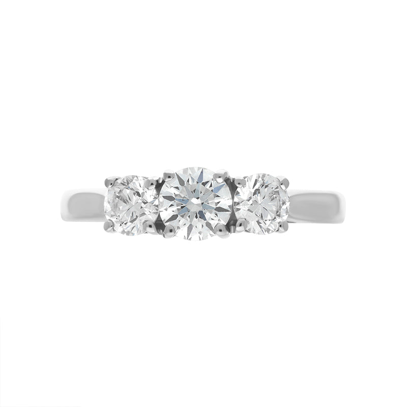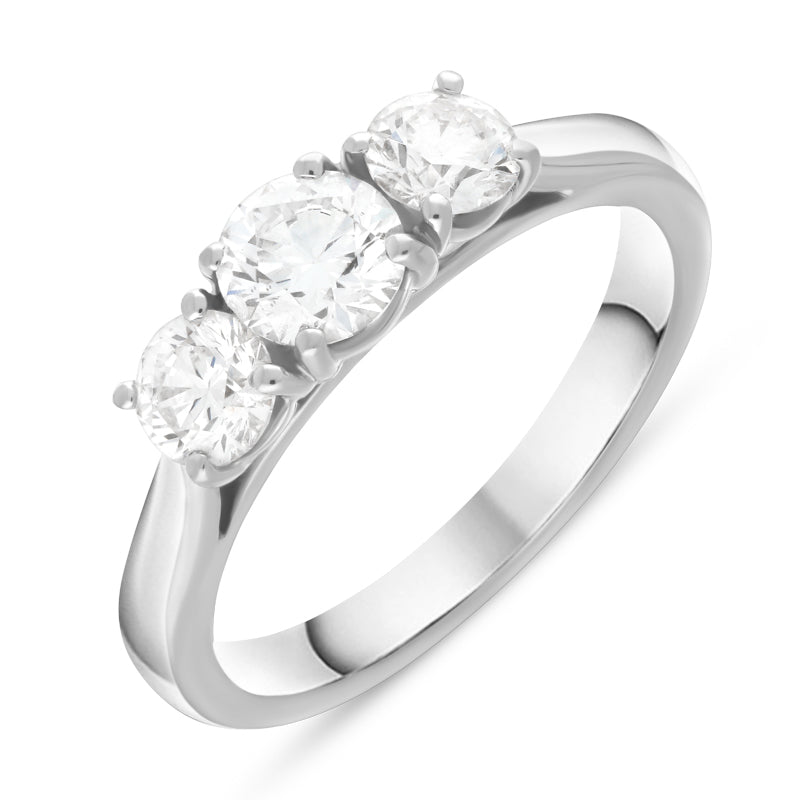This stunning platinum ring features three scallop claw set round brilliant cut diamonds (centre 0.47ct, outer 0.56ct, total 1.03ct). The platinum band gives this beautiful ring a solid and substantial weight, making this a piece that will be treasured for generations to come.