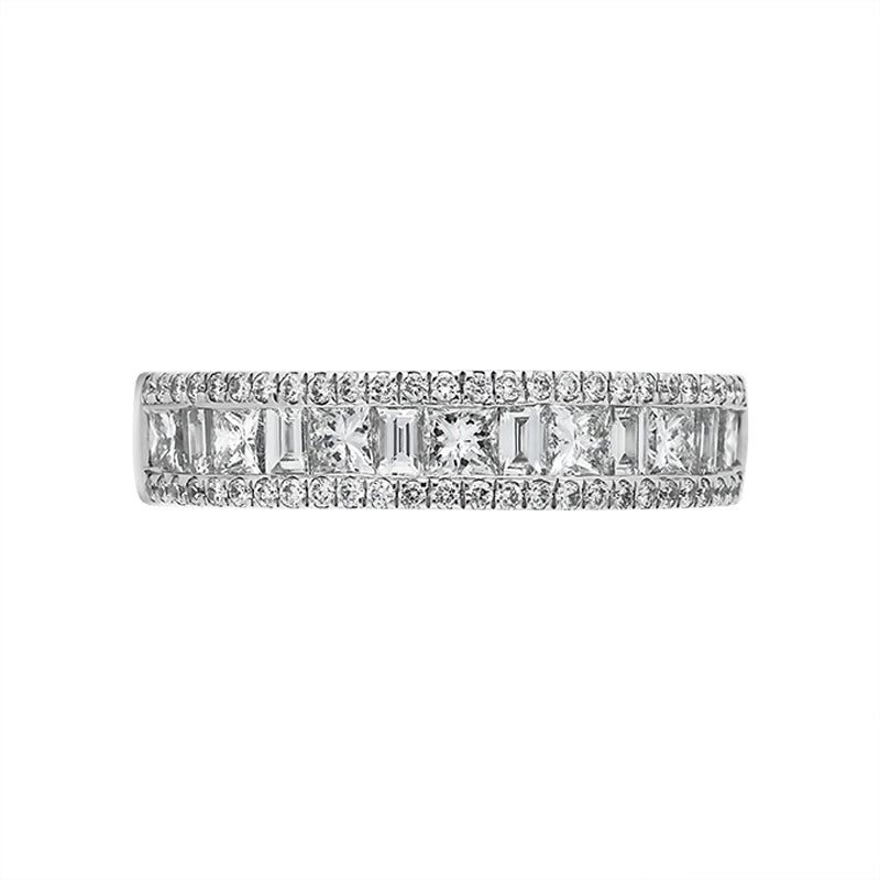 This stunning band ring features a mix of round brilliant, emerald and princess cut diamonds, with a total diamond weight of 1.08ct. The glittering stones are set in 18ct white gold to create the most beautiful eternity ring. Designed perfectly for everyday wear, this diamond set piece would make the perfect dress or eternity ring to sit comfortably alongside other rings or wear alone as a stand out piece.