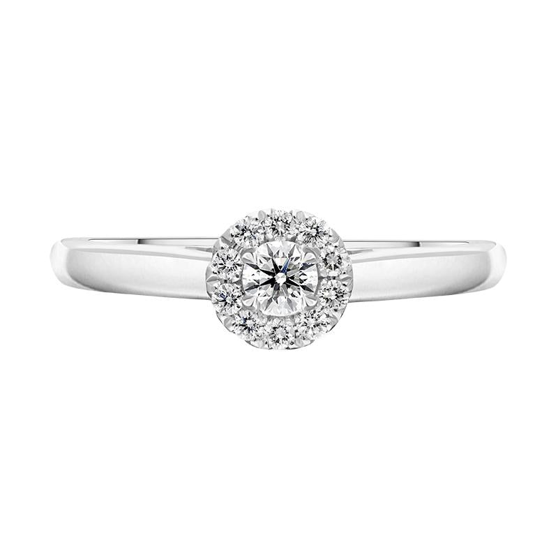 Elegant and timeless, this exquisite round ring features a central brilliant cut solitaire diamond, totalling 0.20cts, claw set in solid platinum and framed beautifully by sparkling pave set diamonds, totalling 0.20cts. Minimalist and sophisticated, this diamond set ring has been designed perfectly to sit comfortably alongside a wedding band and makes the perfect diamond engagement ring.