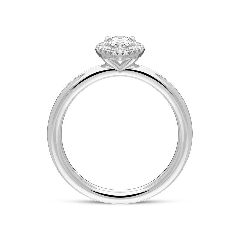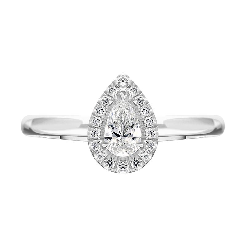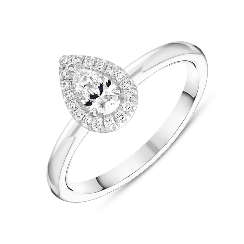 Elegant and classic, this exquisite pear cut ring features a central brilliant cut solitaire diamond, claw set in platinum and framed beautifully by sparkling pave set diamonds forming a pear shape, totalling 0.39cts. This feminine pear shaped diamond sits on a solid platinum band and will be treasured by generations to come.