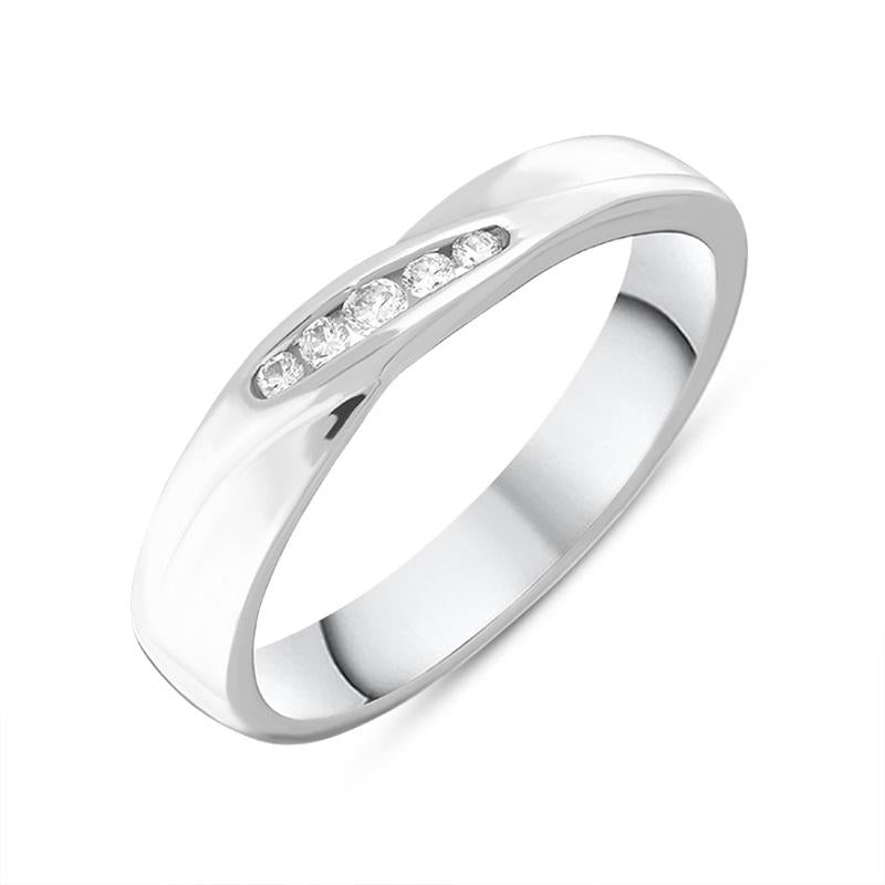 This stunning band ring features a total of five brilliant cut diamonds. The sparkling diamonds are channel set into the centre of a crossover style band. The beautiful ring has a solid and substantial weight, making this a piece that will be treasured for generations to come.