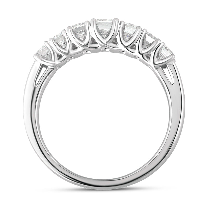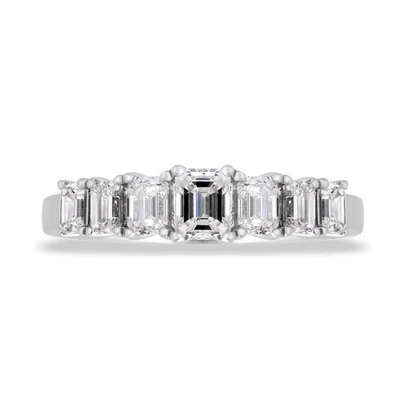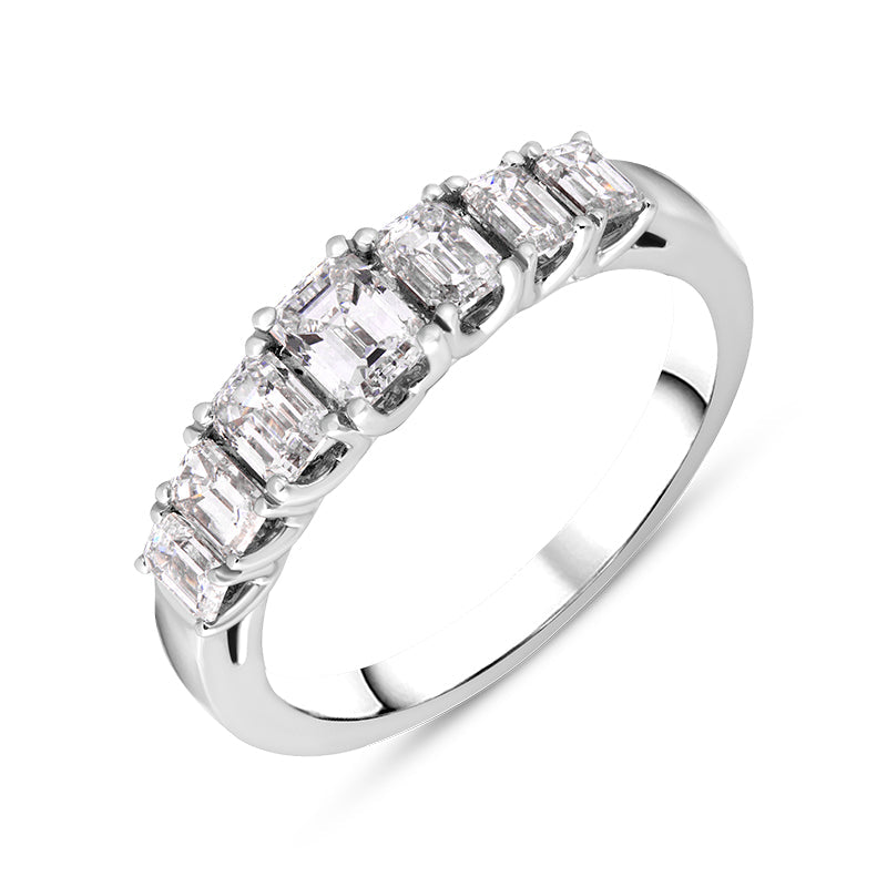 This stunning platinum ring features seven graduating emerald cut diamonds totalling 1.13ct. The diamonds are claw set in platinum for a glittering finish. The platinum band gives this beautiful ring a solid and substantial weight, making this a piece that will be treasured for generations to come.