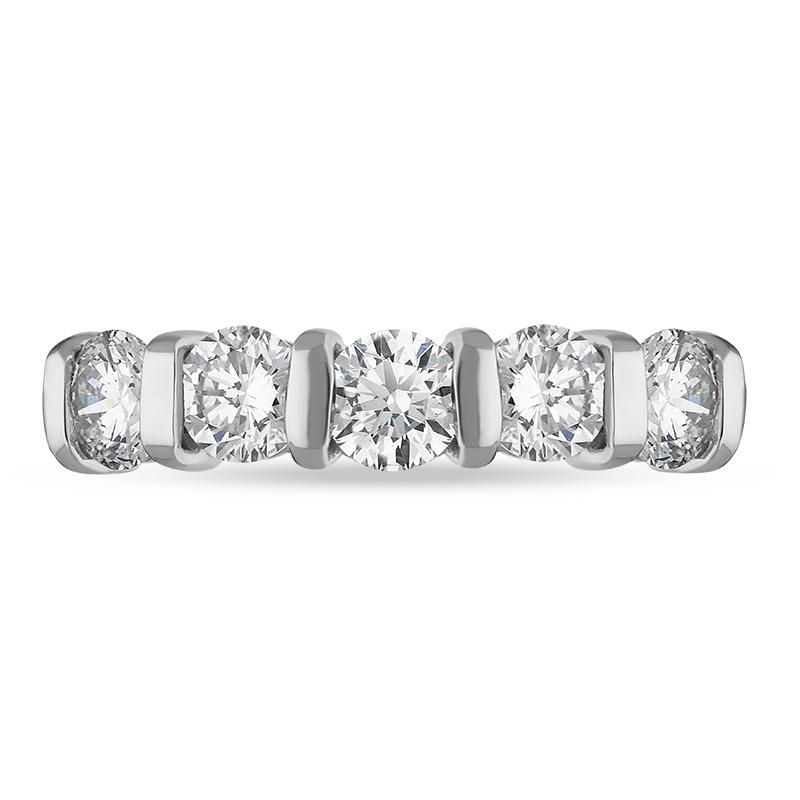 This stunning platinum ring features five round brilliant cut diamonds totalling 1.25ct, bar set in platinum. The platinum band gives this beautiful ring a solid and substantial weight, making this a piece that will be treasured for generations to come.