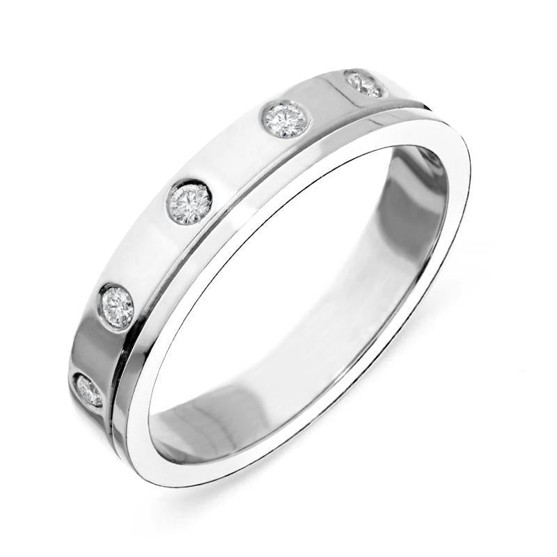This stunning wedding band is hand set with brilliant cut diamonds. The flush setting means that the ring has a comfortable polished finish. The platinum band gives this beautiful ring a solid and substantial weight, making this a piece that will be treasured for generations to come.