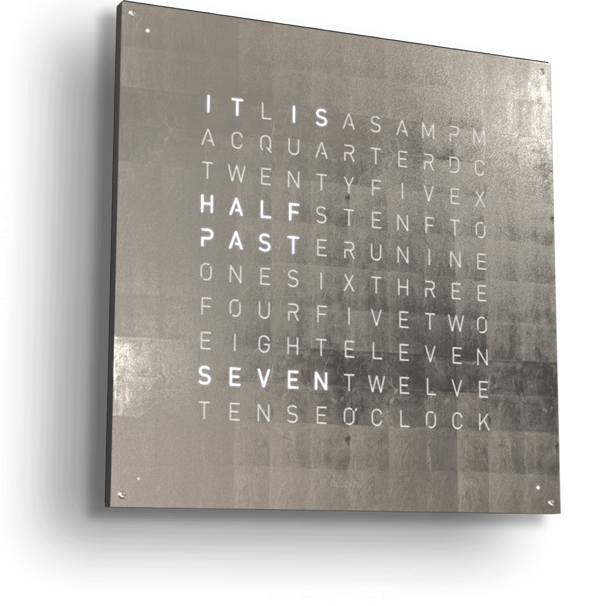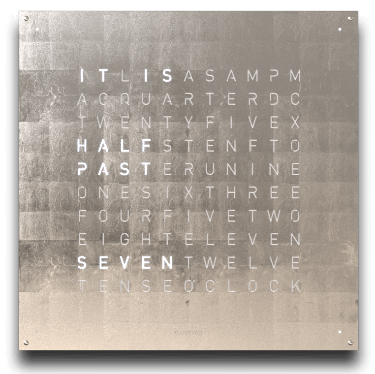 • SILVER & GOLD - The QLOCKTWO EARTH 90 CREATOR’S EDITION SILVER & GOLD is made according to the same principle as its golden sister – covered by hand with leaves of white gold and delivered on a white clock body. The oxidised silver creates an uneven patina which is fixed once the desired colouring is achieved and provides this unique piece with its random surface structure that is truly one of a kind.