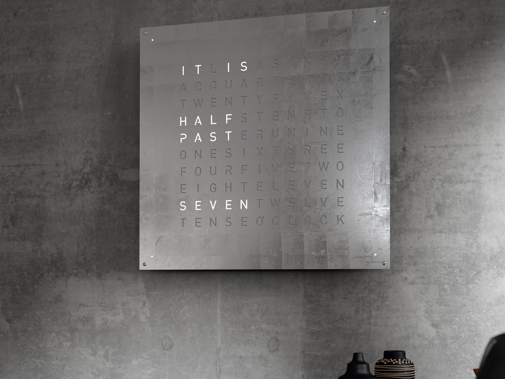 • PLATINUM - The QLOCKTWO EARTH 90 CREATOR’S EDITION PLATINUM is plated with platinum (Pt 950) by hand. Edge to edge, each letter cutout is processed. The mysterious dark shimmer gives the white platinum front cover a special aura and comes delivered on a black clock body. The interaction of the white, grey and silver tones contrasts with the Black Body, the art object makes a clear statement for the luxury of deceleration in any room.