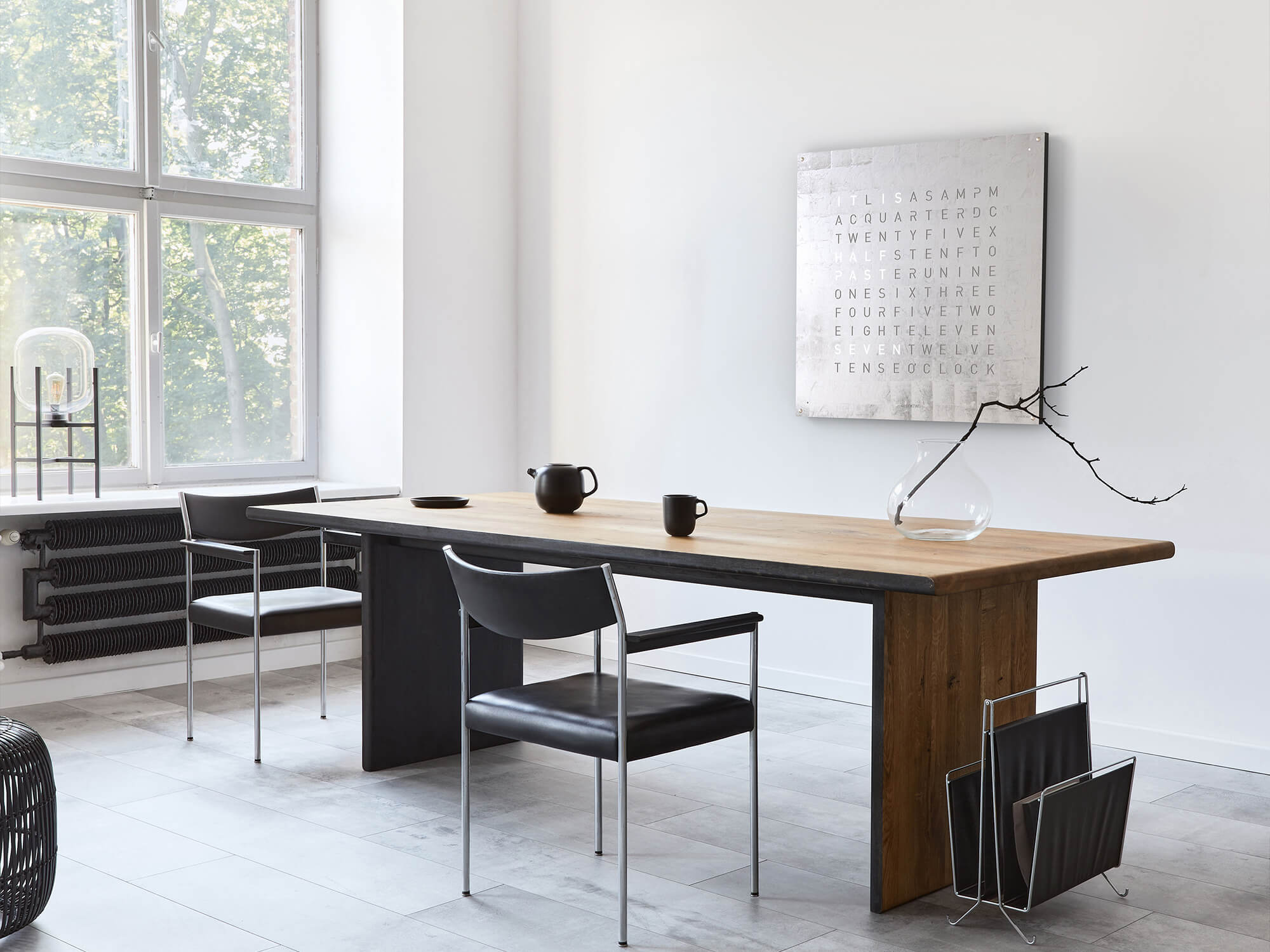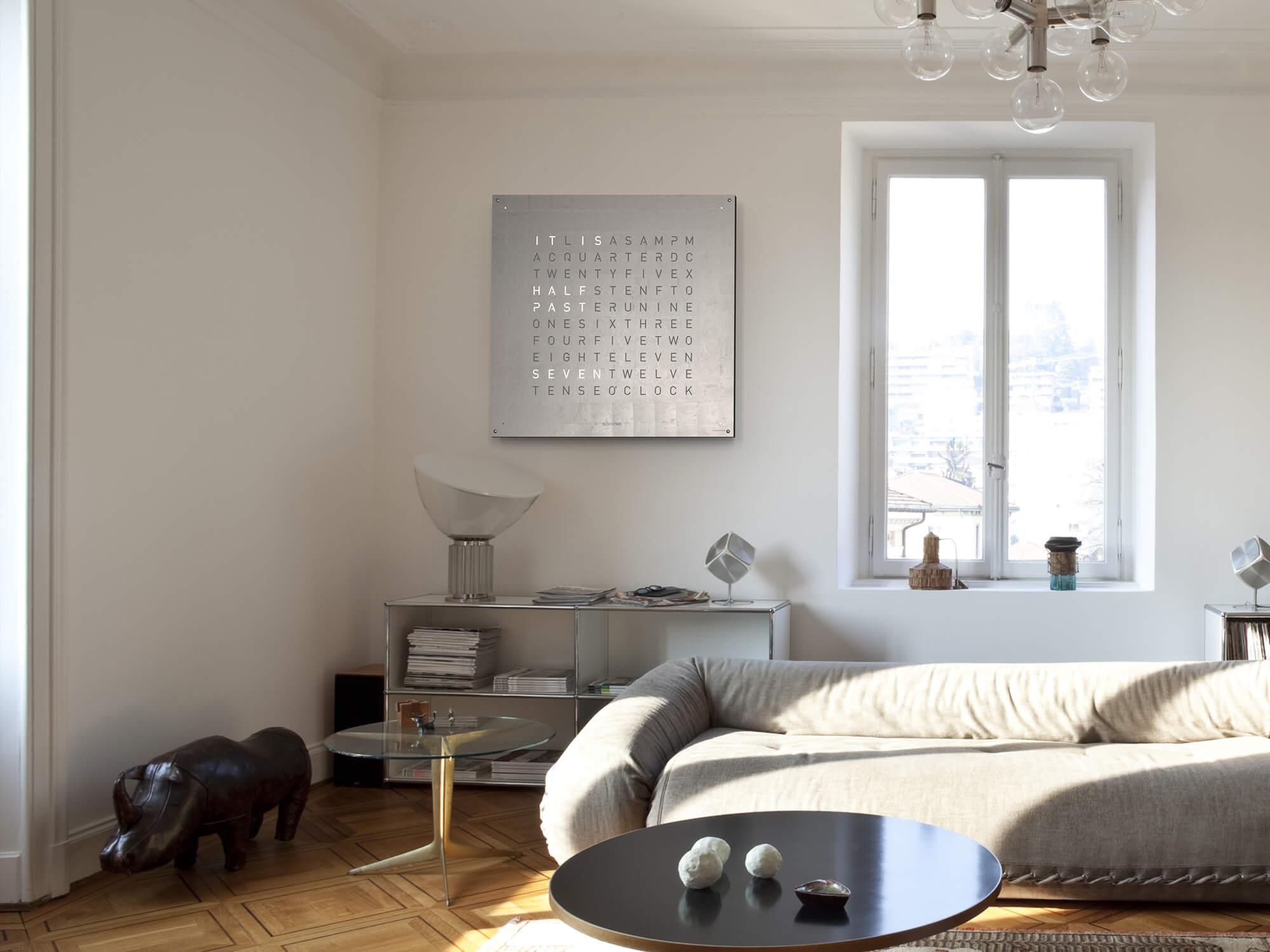 The typographic font combines the moment with the written word and makes a statement: “IT IS QUARTER PAST SEVEN. The words change in five minute increments, with four small, illuminated corner points displaying the minutes in between. QLOCKTWO EARTH appears to float elegantly when wall mounted and if the power connection is visible a coloured textile cable can be added for an additional design element.