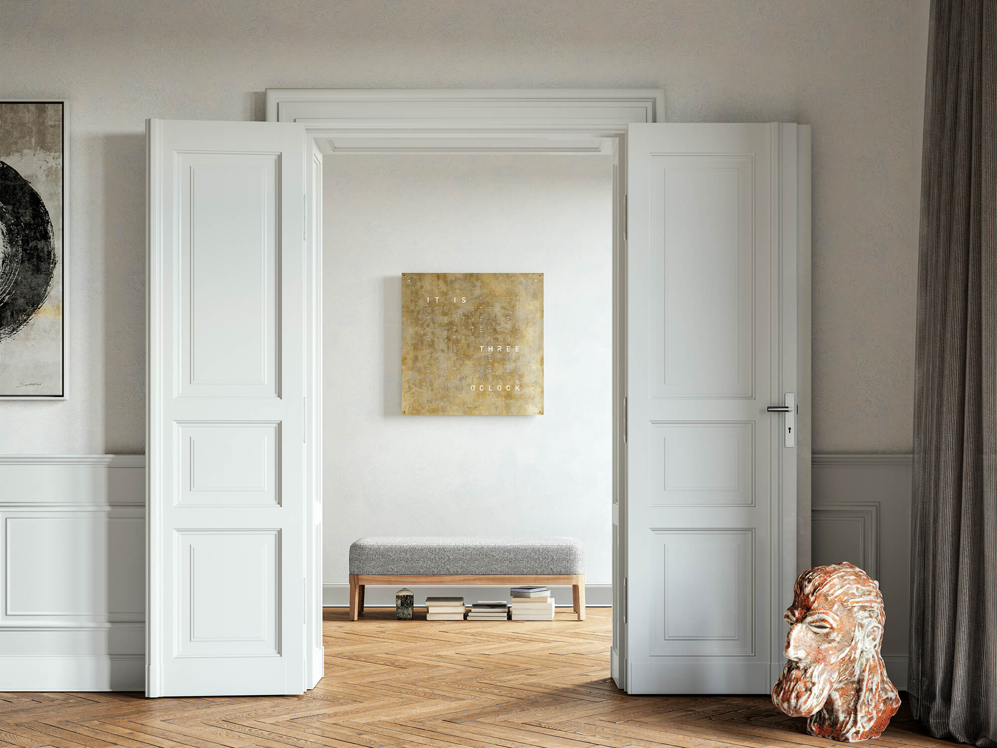 • GOLD - The stainless-steel surface of the QLOCKTWO EARTH 90 CREATOR’S EDITION GOLD is covered with gold leaves by hand. Edge by edge every cut-out letter is finished carefully, giving the front cover the typical gold-leaf structure and ensuring a truly royal appearance. Delivered on a white clock body.