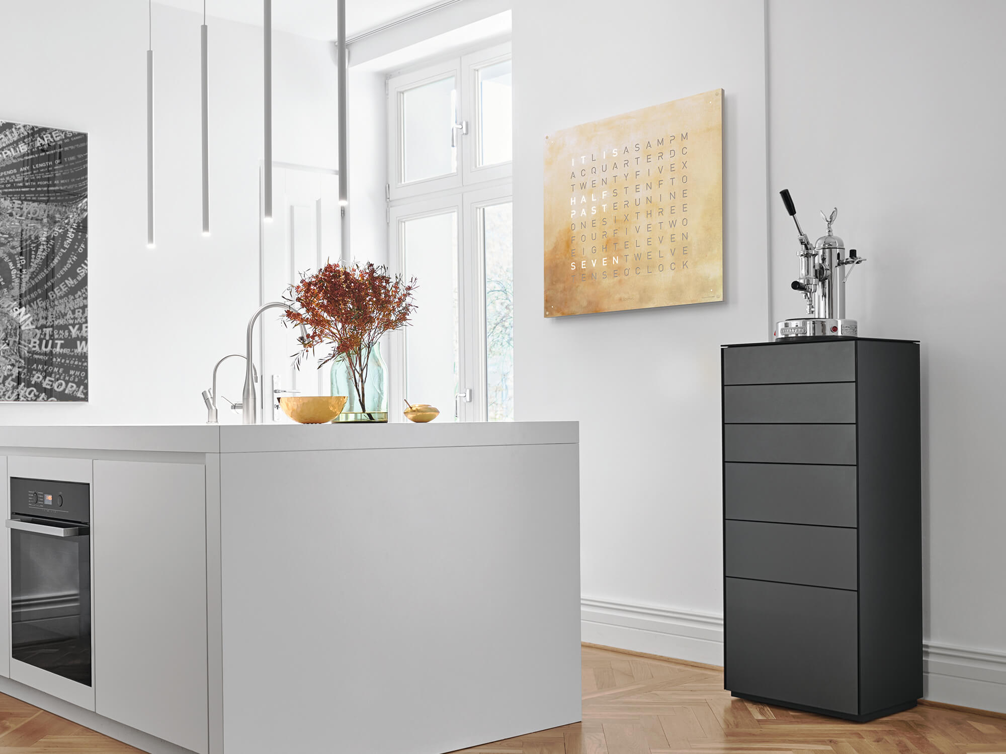 The typographic font combines the moment with the written word and makes a statement: “IT IS QUARTER PAST SEVEN. The words change in five minute increments, with four small, illuminated corner points displaying the minutes in between. QLOCKTWO EARTH appears to float elegantly when wall mounted and if the power connection is visible a coloured textile cable can be added for an additional design element.