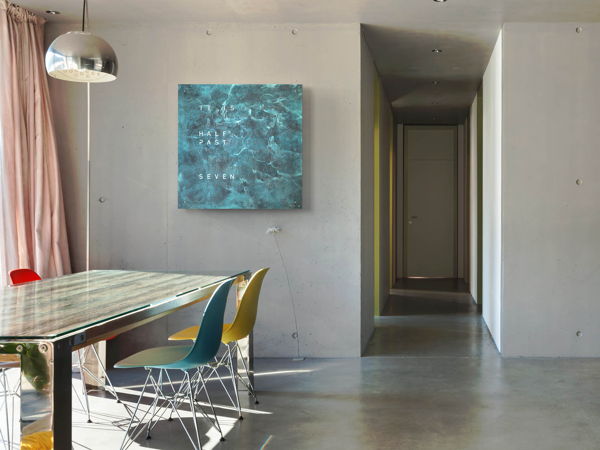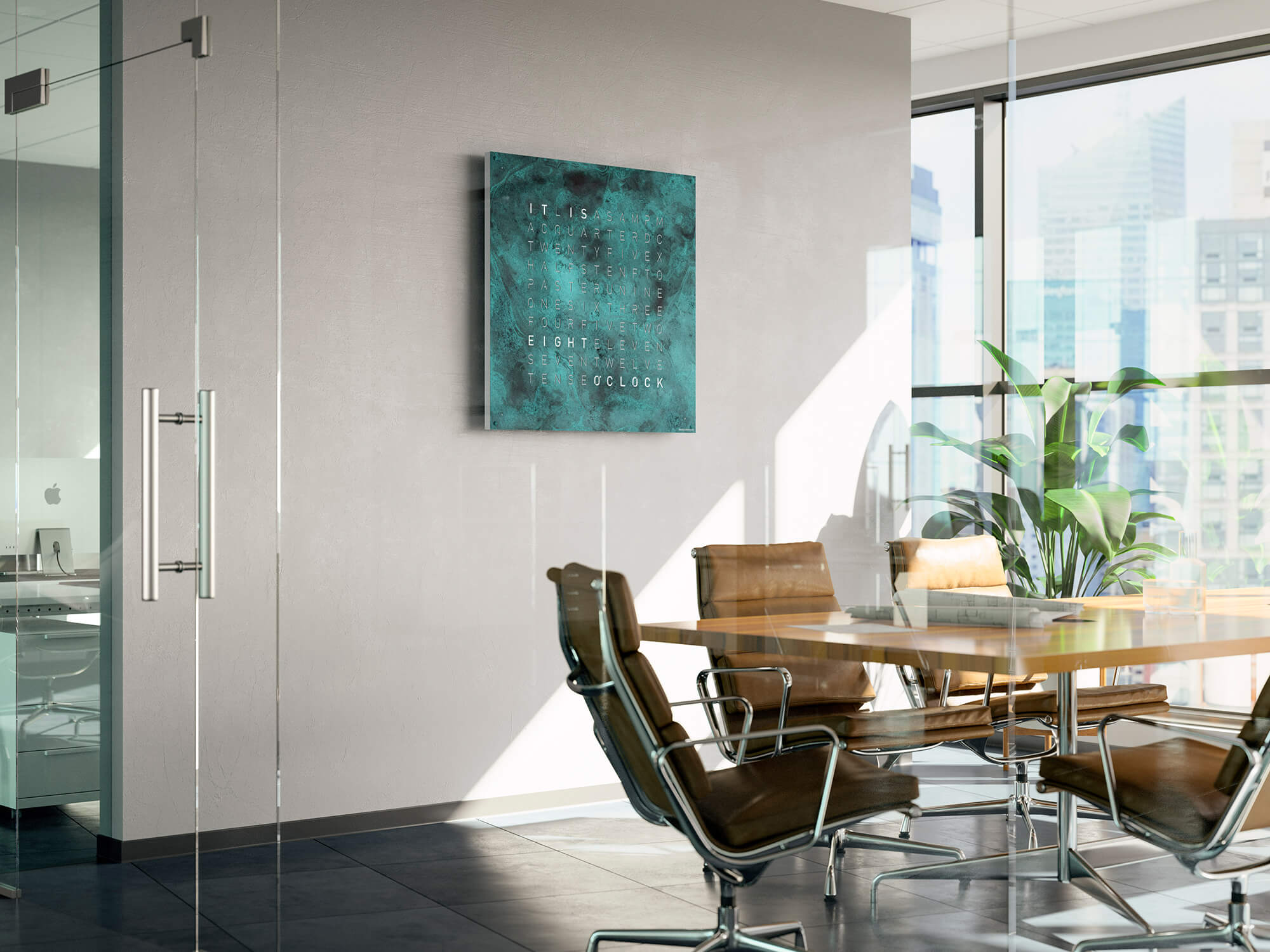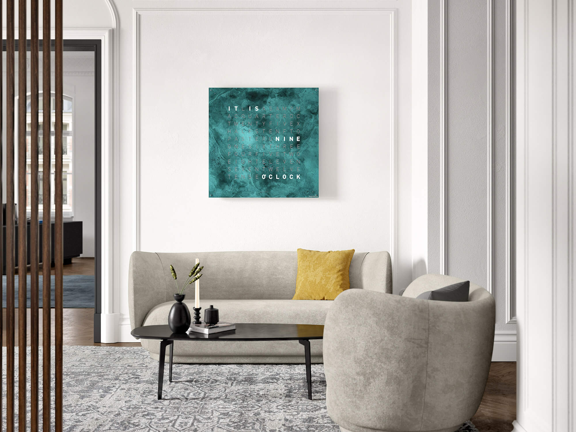 The typographic font combines the moment with the written word and makes a statement: “IT IS QUARTER PAST SEVEN. The words change in five minute increments, with four small, illuminated corner points displaying the minutes in between. QLOCKTWO EARTH appears to float elegantly when wall mounted and if the power connection is visible a coloured textile cable can be added for an additional design element.