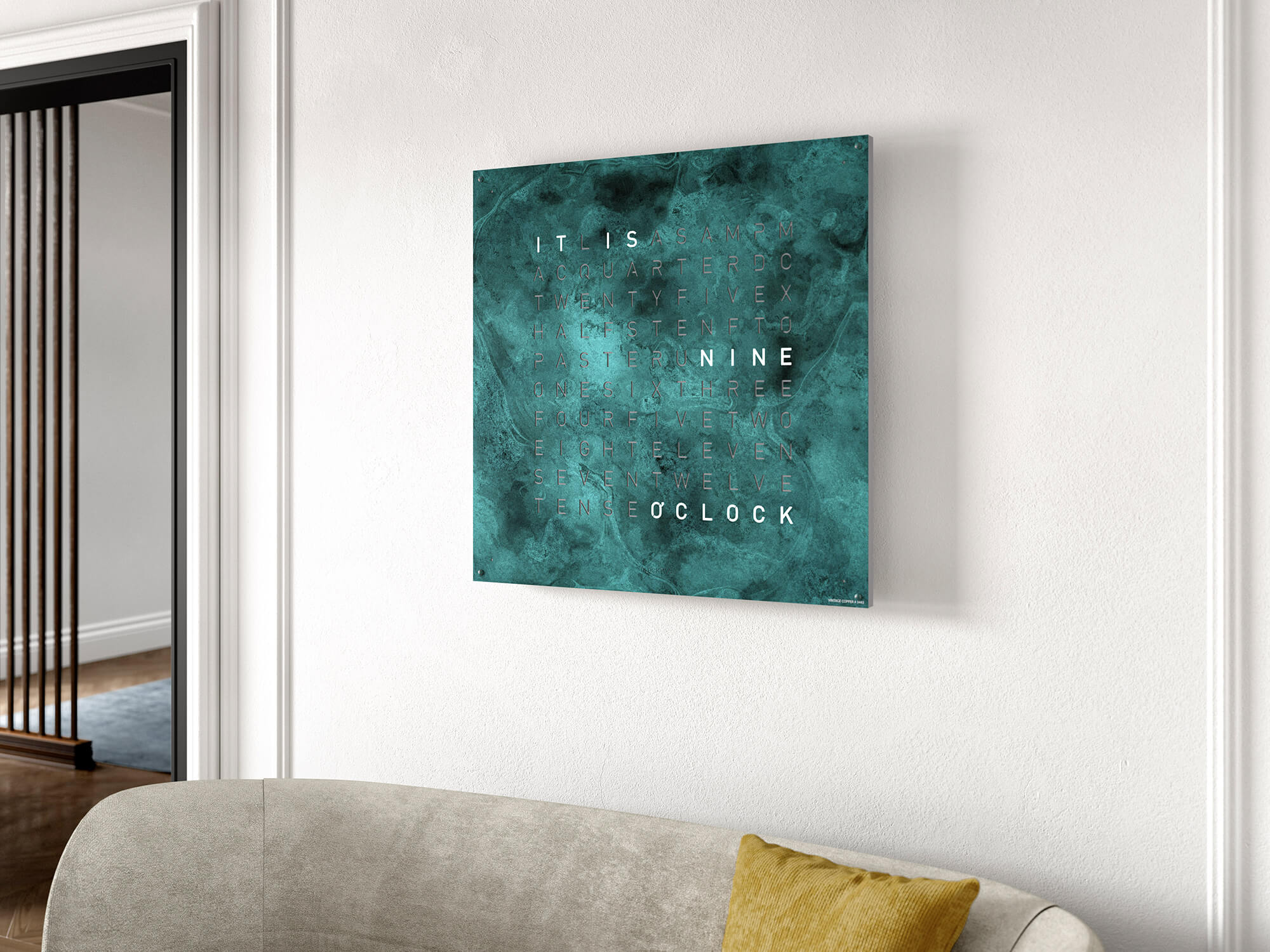 • GLINTSCAPE - The QLOCKTWO EARTH 90 CREATOR’S EDITION GLINTSCAPE is created with million-year-old sedimentary rock, which fascinates with a unique relief of random irregularities and a pearlescent surface. Delivered on a white clock body. With its tones of green, red and gold, the object is reminiscent of an autumn landscape reflected in a sparkling lake.