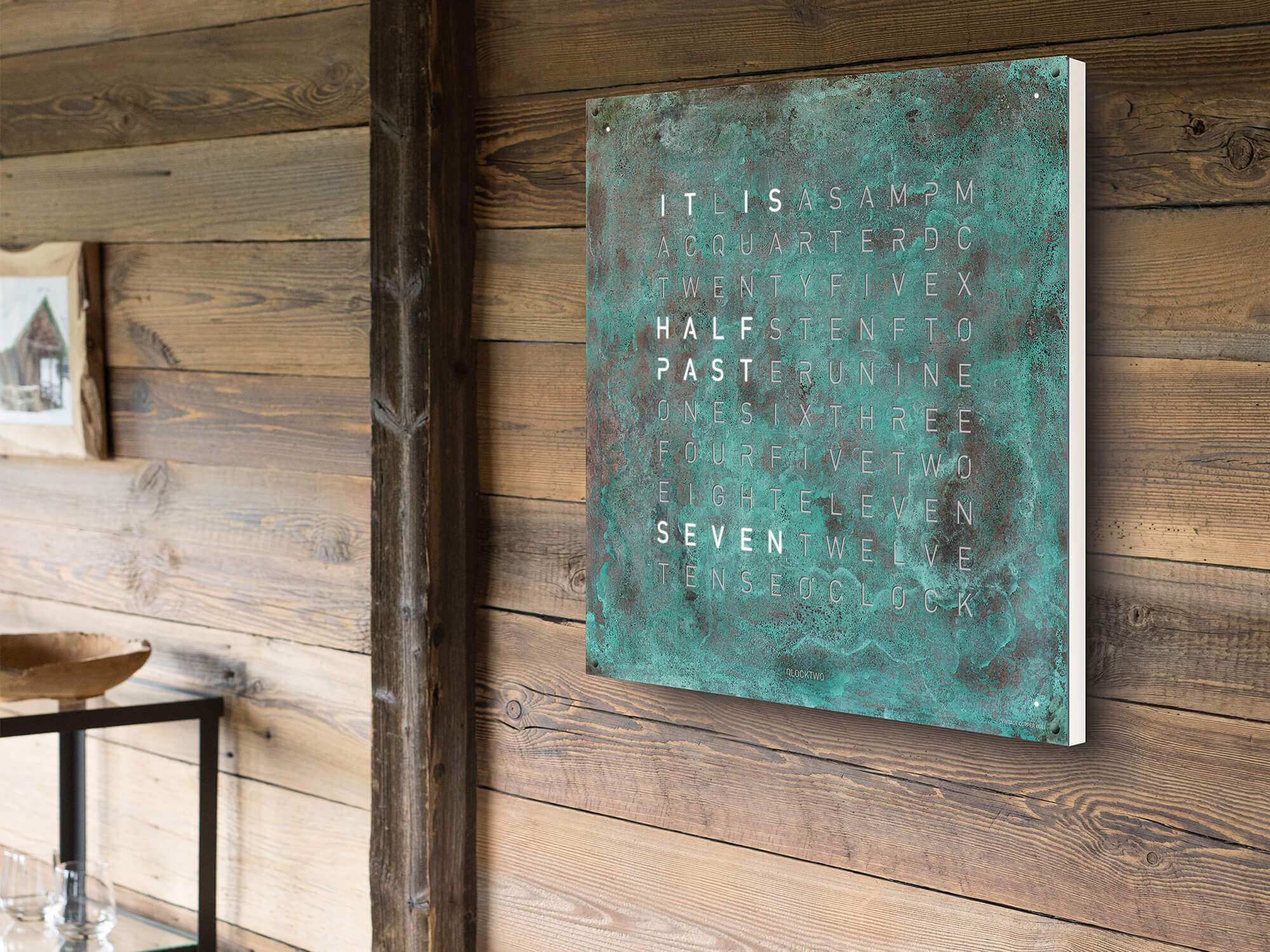 • VINTAGE COPPER - The QLOCKTWO EARTH 90 CREATOR’S EDITION VINTAGE COPPER, is a lively, unique surface. Inspired by the naturally patinated copper on roofs, sculptures, and coins. Delivered on a white clock body, the surface is fixed indelibly.