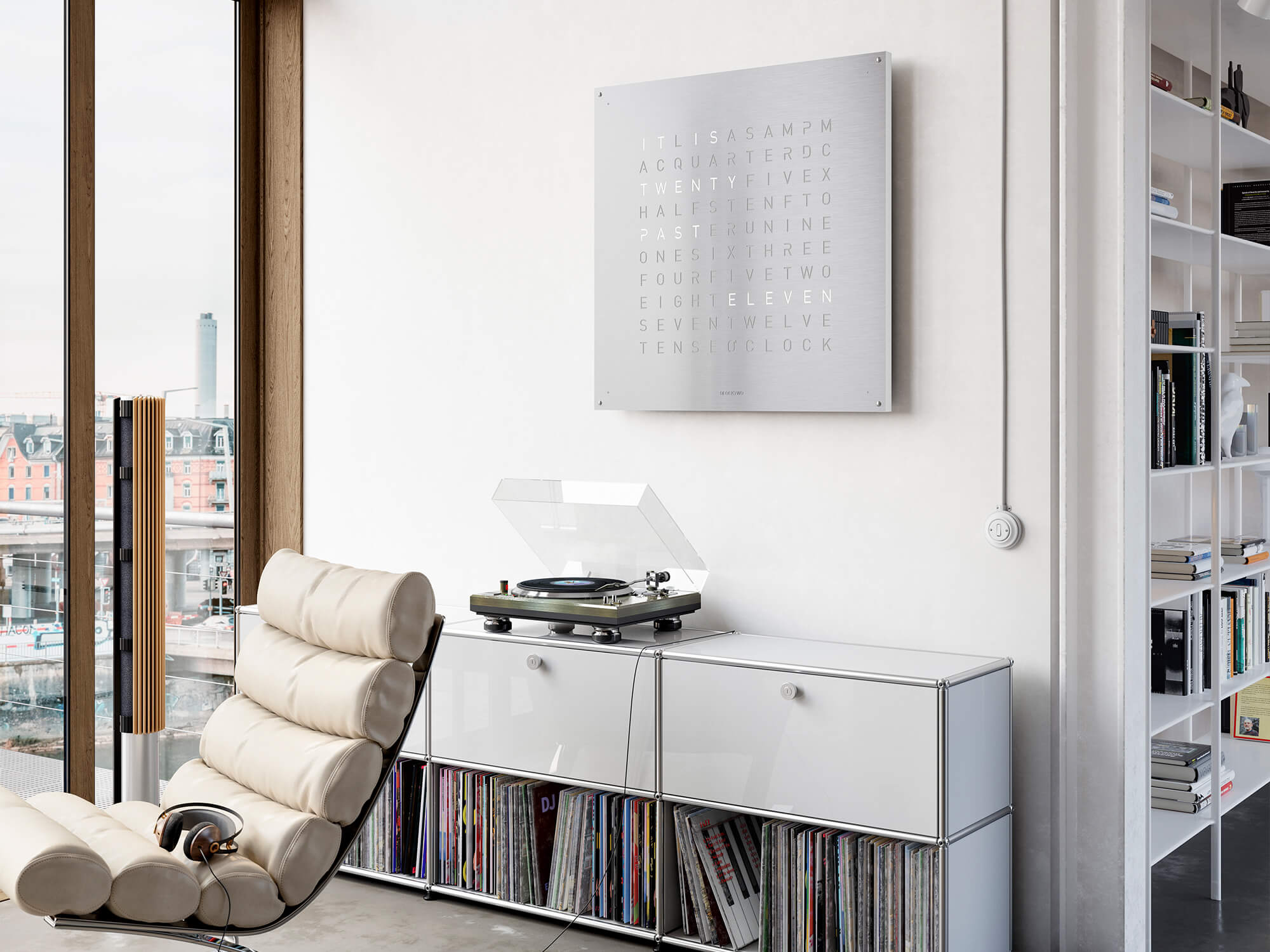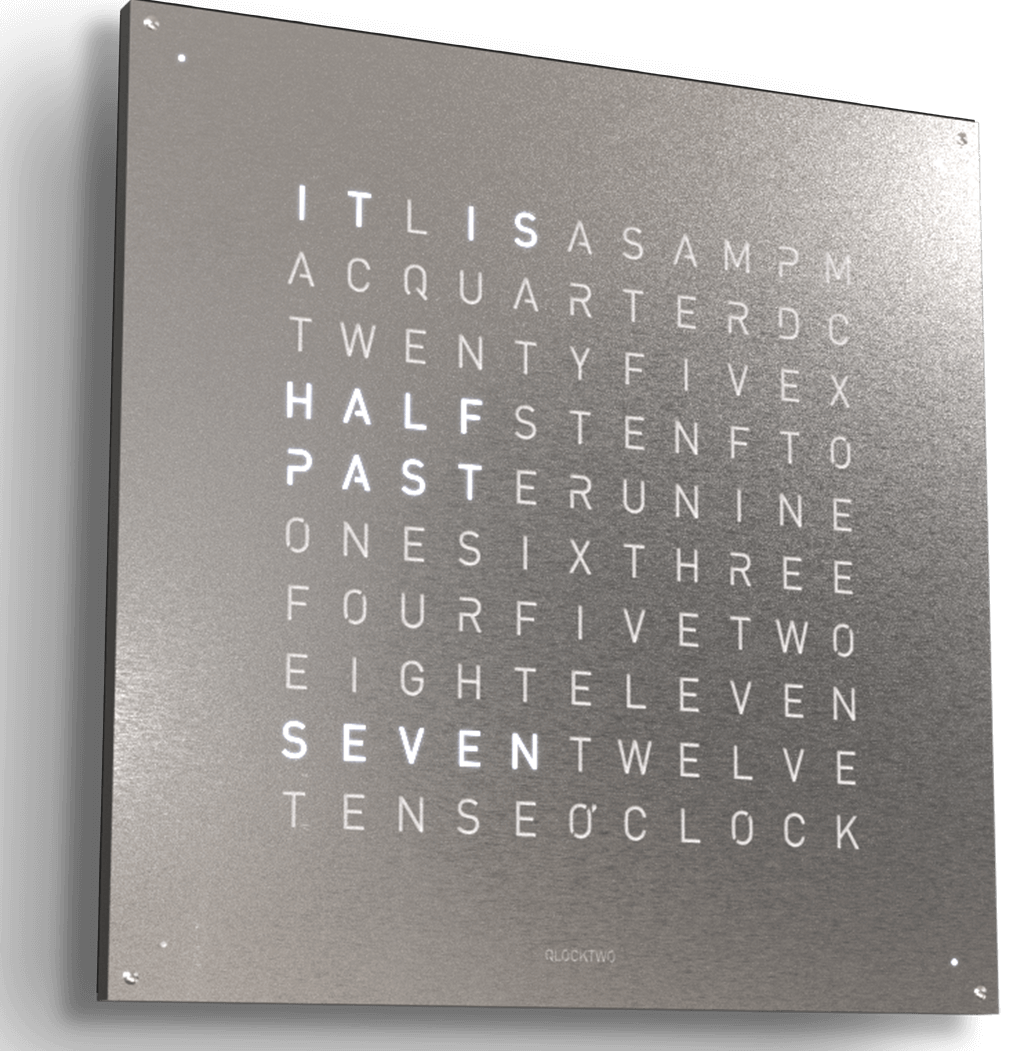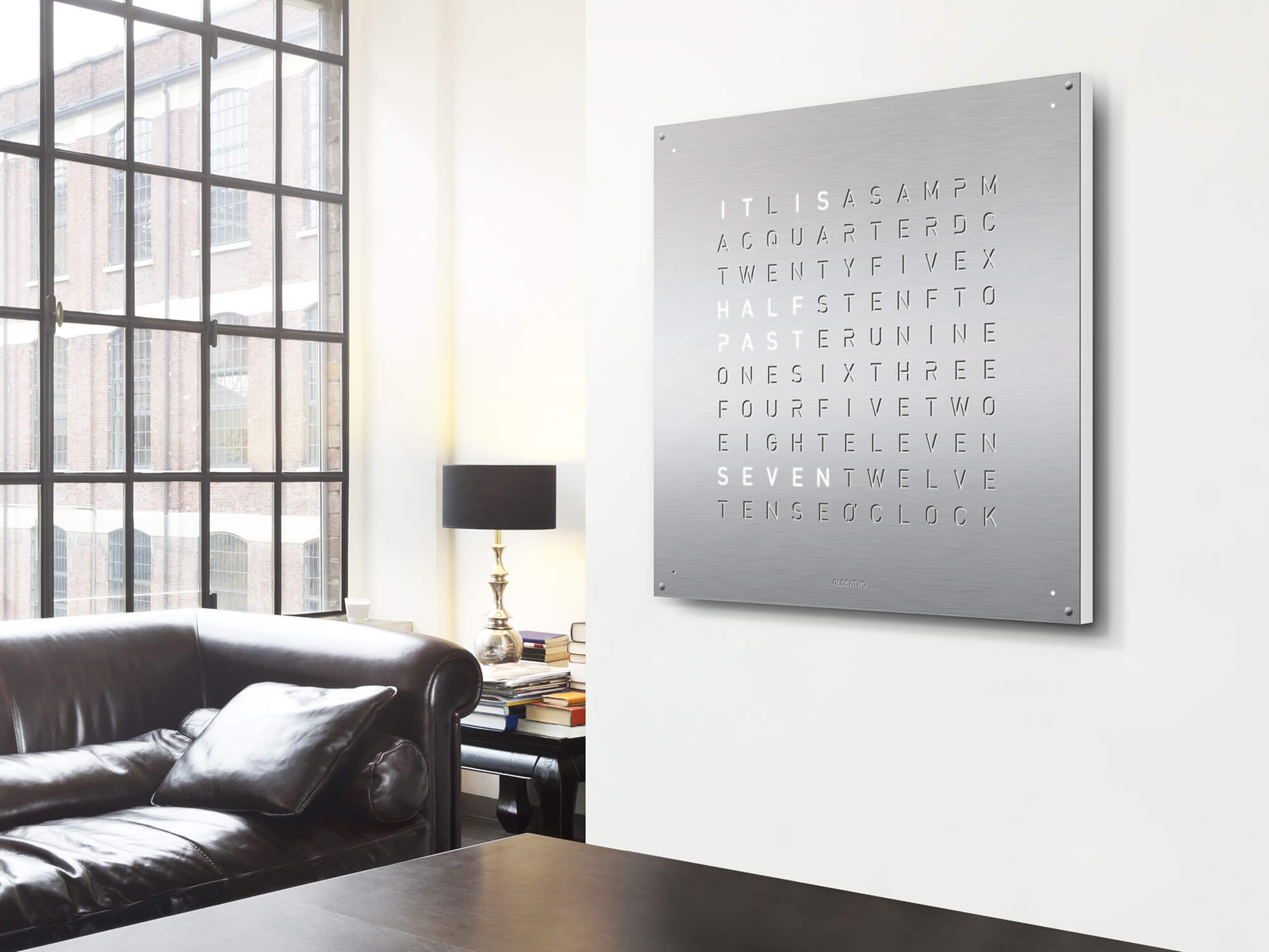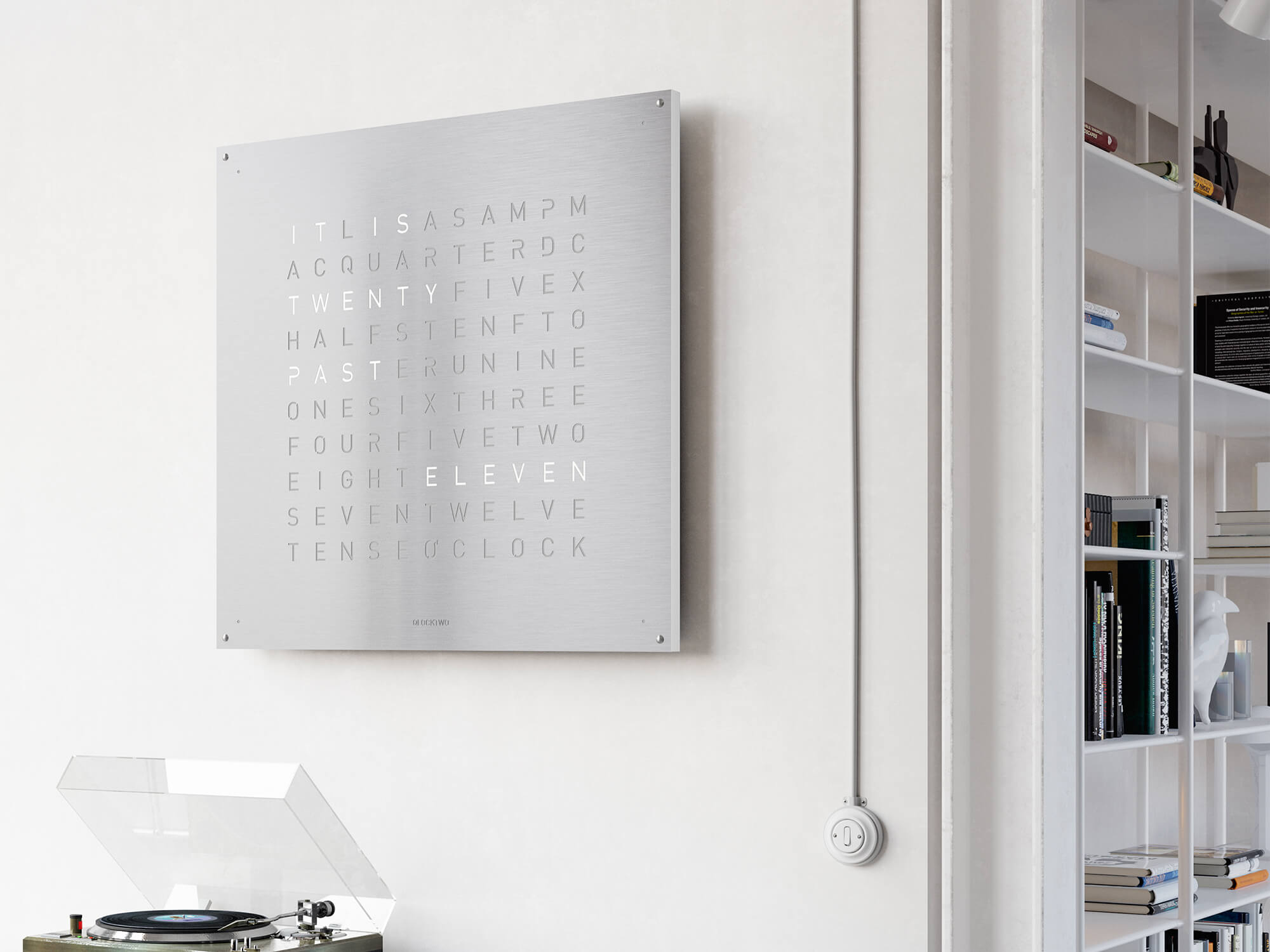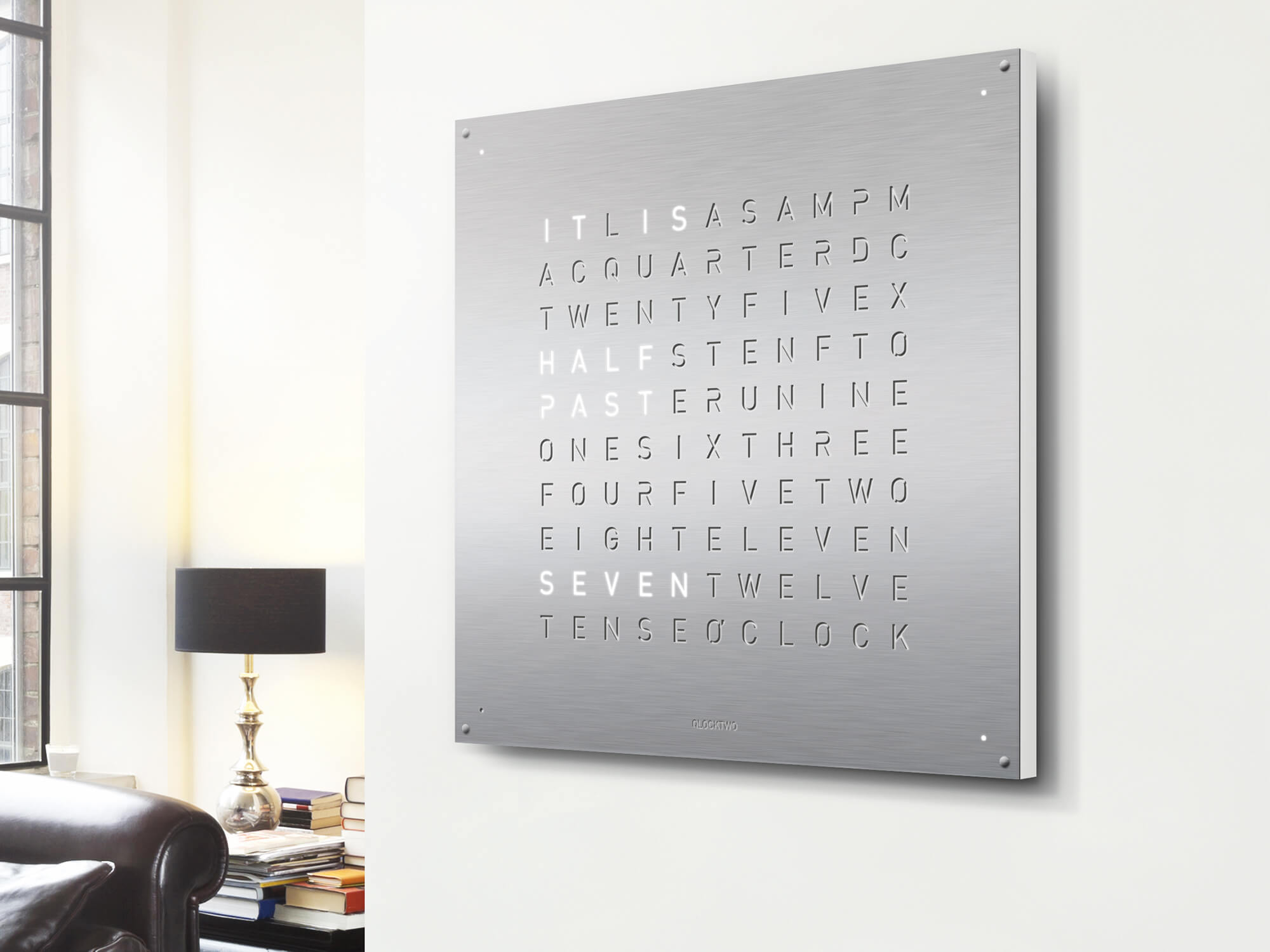 The typographic font combines the moment with the written word and makes a statement: “IT IS QUARTER PAST SEVEN. The words change in five minute increments, with four small, illuminated corner points displaying the minutes in between. QLOCKTWO EARTH appears to float elegantly when wall mounted and if the power connection is visible a coloured textile cable can be added for an additional design element.