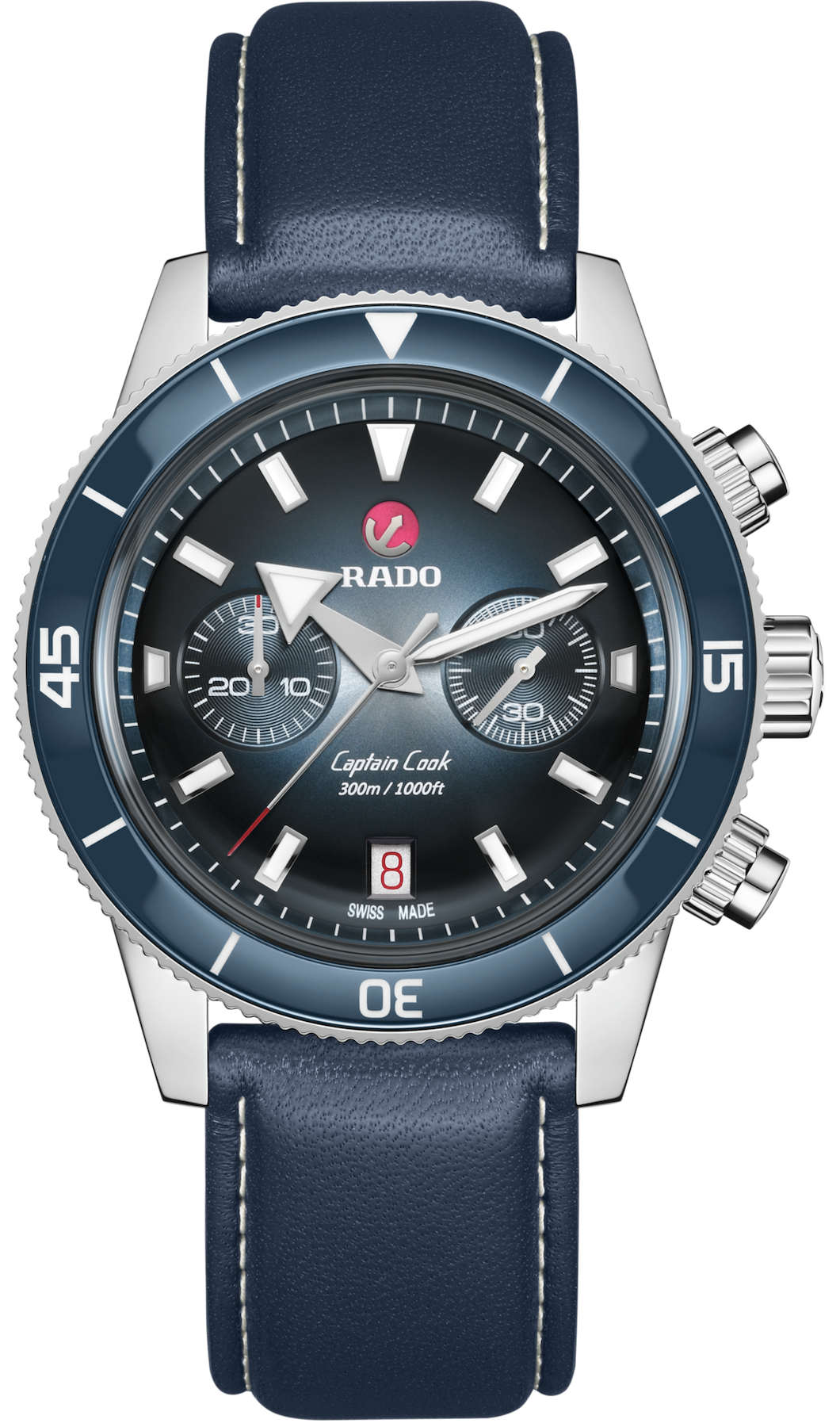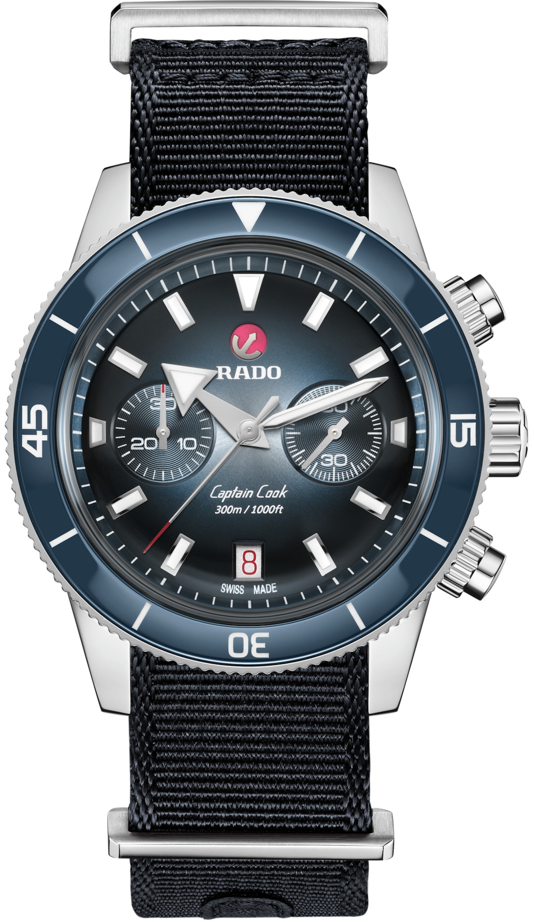 The Captain Cook Chronograph wears a characteristic box shaped, scratch resistant sapphire crystal with anti reflective treatment on both faces. The thin, stylish 43 mm stainless steel case features a polished blue high-tech ceramic inlay on the bezel, complementing the silver to blue gradient dial. The numbers, markers and triangles are treated with Super-LumiNova. Inside, the new, thinner R801 automatic movement, with 37 jewels, five hands and 59 hours of power reserve thanks to an antimagnetic NivachronTM hairspring, exceeds standard test requirements from 3 to 5 positions for higher accuracy.