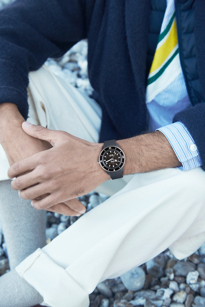 Further modern improvements can also be seen through the Swiss watch manufacturer’s EasyClip System which allows you to change the black rubber strap quickly and easily without the need for any tools. The dial of the Rado Captain Cook High Tech Ceramic watch marks another first for the collection with unmissable smoked sapphire crystal glass offering a glimpse into the automatic winding movement inside. The skeletonised dial really gives the design a distinctive and contemporary personality while the R734 automatic winding calibre within powers the characteristic arrow-shaped hour, minutes and seconds hands and promises a power reserve of 80 hours. At 12 o’clock, the iconic Rado moving anchor symbol is included which is set against a synthetic ruby plate. This splash of red, although subtle is a welcome pop of colour to the rest of the monochromatic design.