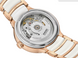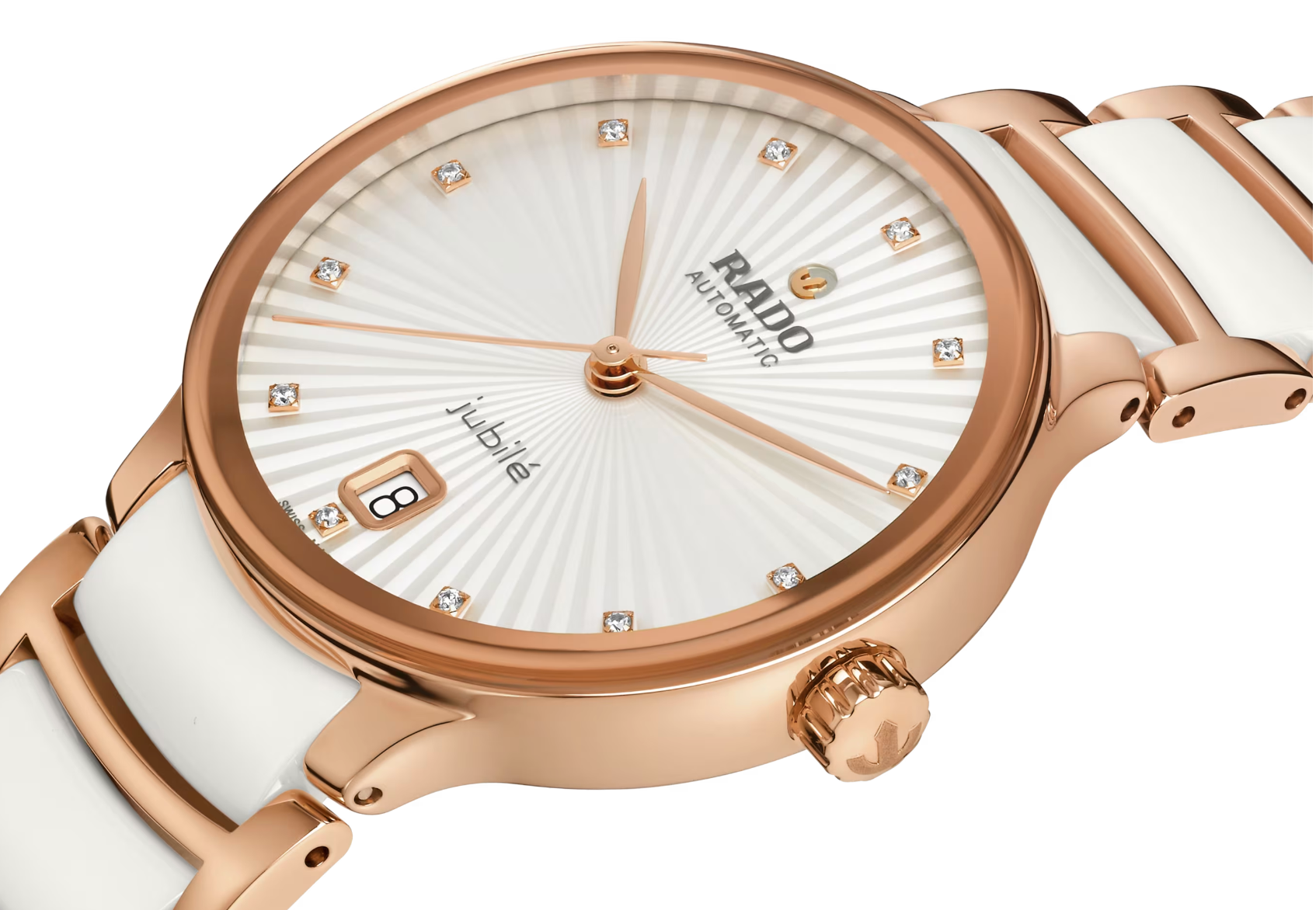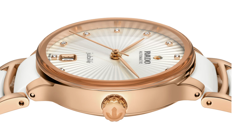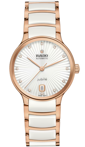 Rado Watch Centrix Automatic Diamonds Ladies R30037744. The classic Centrix Automatic Diamonds watch has been reworked not only technically, but also aesthetically. The modified model has a rounded sapphire crystal that extends all the way to the edge and a curved case blending with the curved crystal edge. The overall appearance of this iconic timepiece is completed with adjusted case lugs and a bracelet made of polished rose-gold-coloured PVD-coated stainless steel with white high-tech ceramic middle links. The silver facetted dial has an opulent 3D effect created by stamping a shaped dial and then filling it with lacquer. Inside, the three-hand calibre R763 movement exceeds standard accuracy test requirements from 3 to 5 positions, thanks to its antimagnetic Nivachron™ hairspring for increased reliability and accuracy. The watch is water resistant down to 50 m and offers 80 hours of power reserve.