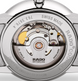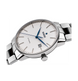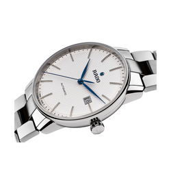 The crisp white dial is stunning with its striking textured finish that seems to glisten beneath the scratch resistant sapphire crystal glass that has been treated with antireflective coating for easy readability. Contrasting beautifully to the dial are steel hands painted in a colourful blue shade and a date box at three o clock while the slim silver indices pair beautifully with the stainless steel bracelet.