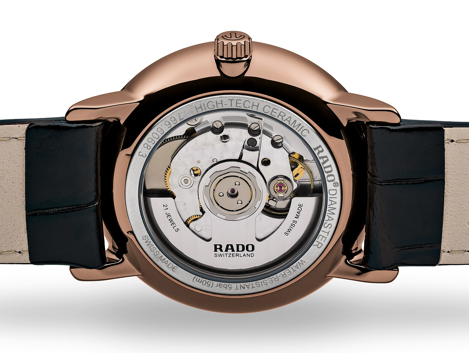 Matching the splendour of the case is a pure silver-white sunray-finished dial adorned with rose gold hands for the hours, minutes ands seconds, twelve rose gold Roman numerals for the hour markers and a white window at 3 o’clock for the date display. Fuelling each of these functions is the Calibre A31 automatic winding movement which continues to impress with a power reserve of 64 hours and a beautifully decorated Cotes de Geneve oscillating rotor, a traditional motif for any Swiss made movement. The rotor alongside some of the 21 jewels can be viewed through the sapphire crystal glass case back. The same scratch resistant crystal protects the dial of the Rado DiaMaster Ceramos watch alongside a non-screw locked crown aiding a 50 metre water resistance. To complete the men’s Rado watch, a sophisticated black alligator leather strap is added alongside a classic folding-style buckle.