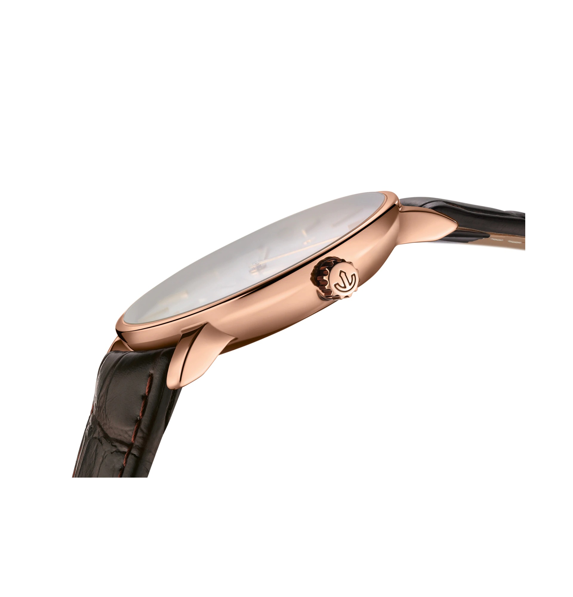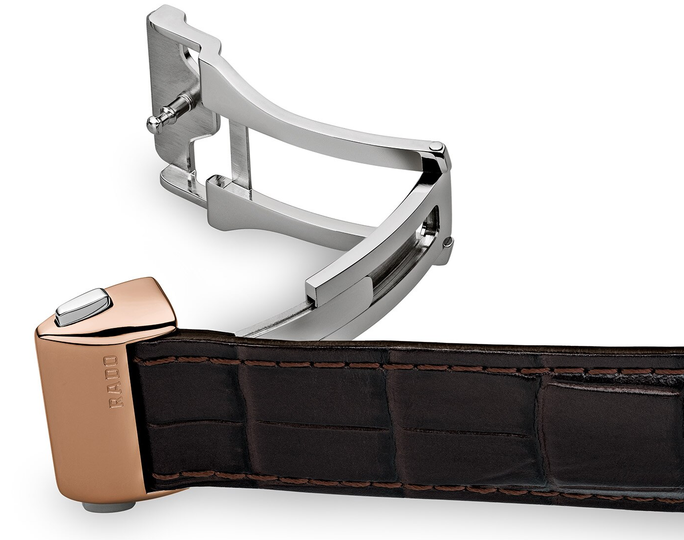 Matching the splendour of the case is a pure silver-white sunray-finished dial adorned with rose gold hands for the hours, minutes and seconds, twelve rose gold stick indexes for the hour markers and a white window at 6 o’clock for the date display. Fuelling each of these functions is the Calibre A31 automatic winding movement which continues to impress with a power reserve of 64 hours and a beautifully decorated Cotes de Geneve oscillating rotor, a traditional motif for any Swiss made movement. The rotor alongside some of the 21 jewels can be viewed through the sapphire crystal glass case back. The same scratch resistant crystal protects the dial of the Rado DiaMaster Ceramos watch alongside a non-screw locked crown aiding a 50 metre water resistance. To complete the men’s Rado watch, a sophisticated black alligator leather strap is added alongside a classic folding-style buckle.