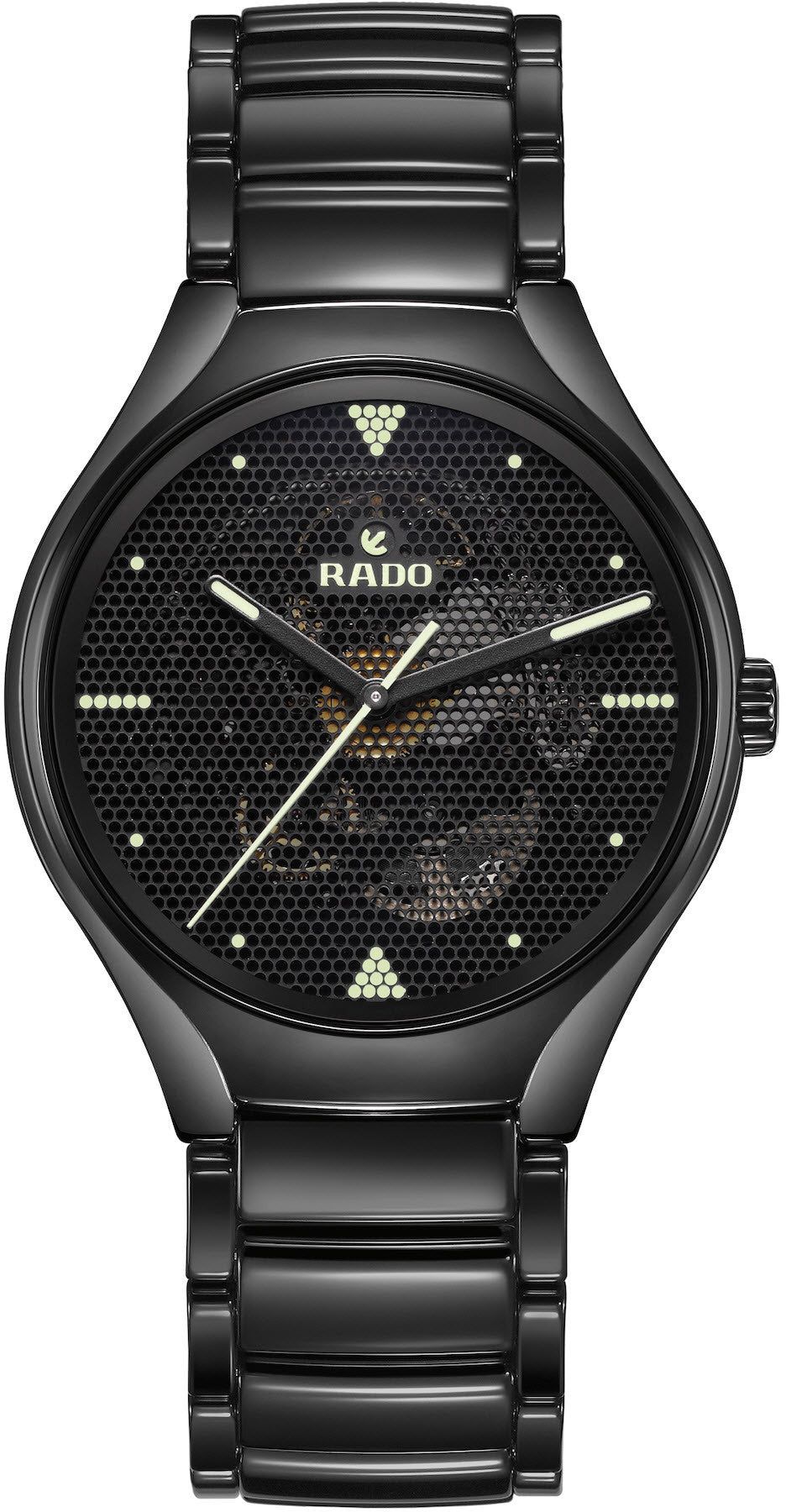 Rado Watch True Phospo Limited Edition R27101192. Housed in a 40 mm matt black high tech ceramic case with matching bracelet, the Rado True Phospo embraces minimalism, but with playful and unexpected elements. The black brass dial is perforated, allowing the Swiss automatic movement below to shine through Ð a thoroughly modern approach to the traditional skeleton watch. The perforations also provide an opportunity for the application of the luminescent indexes, which are created by filling the empty spaces with Super LumiNova to create geometric shapes. Additionally, the hour and minute hands are tipped with Super LumiNova, while the second hand is fully coated in the glow in the dark substance.