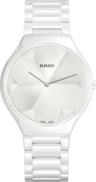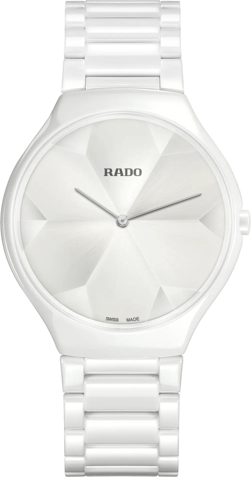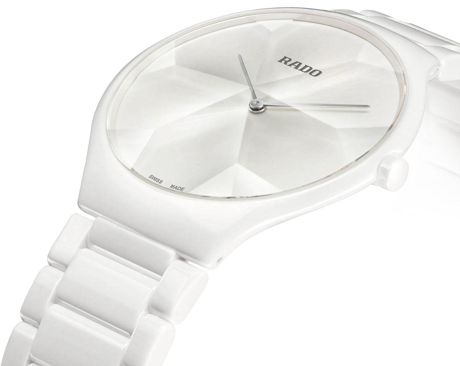 Rado Watch True Thinline Great Gardens of the World Winter R27007032. The True Thinline x Great Gardens of the World Chapter 7 (Winter) concludes the four seasons. Serene and regal in white high tech ceramic, the polished monobloc 39 mm case, crown and bracelet carry the same peaceful mood that envelopes the timepiece behind its snowflake facetted sapphire crystal. A cool white flange surrounds the silver coloured dial and its dark grey logo, while the R420 quartz movement keeps time reliably and precisely. The bracelet is made of polished white high tech ceramic, which produces an even more sensuous feel.