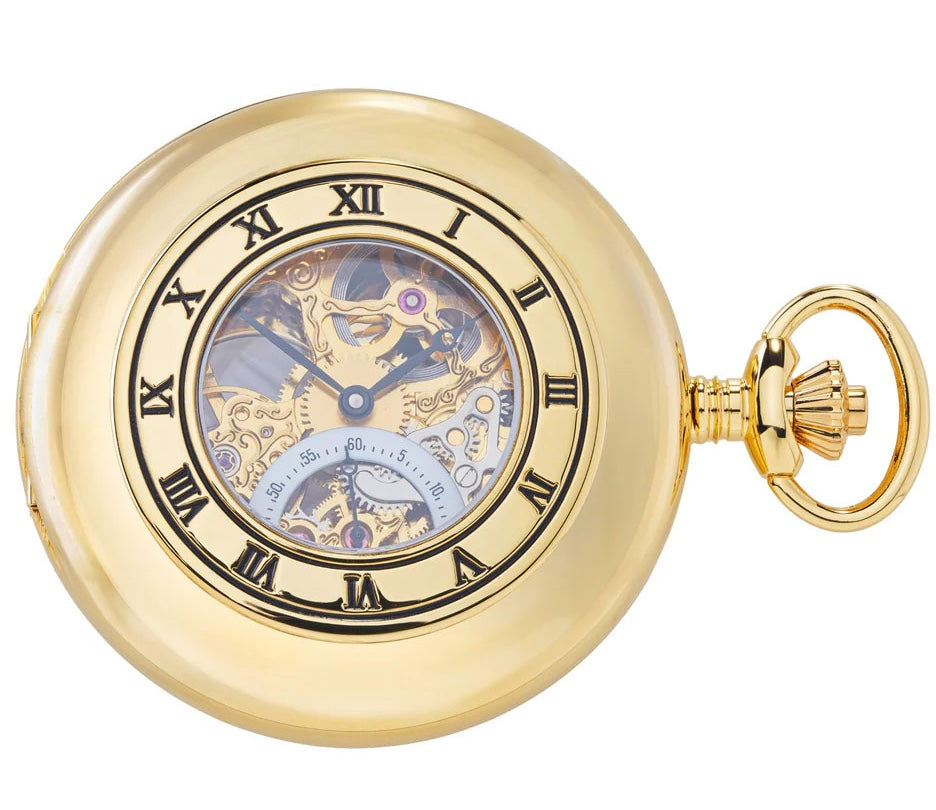 Rapport Pocket Watch Mechanical Half Hunter Gold Tone PW44. These mechanical 17 jewel, double opening half hunter, pocket watches have a window on the back of the case to view balance wheel and a skeleton movement with white Roman dial.