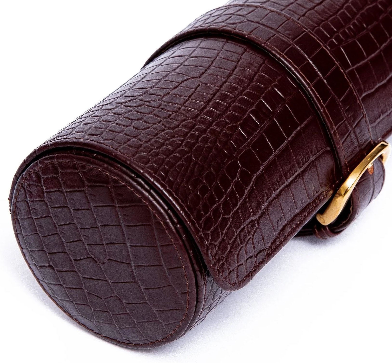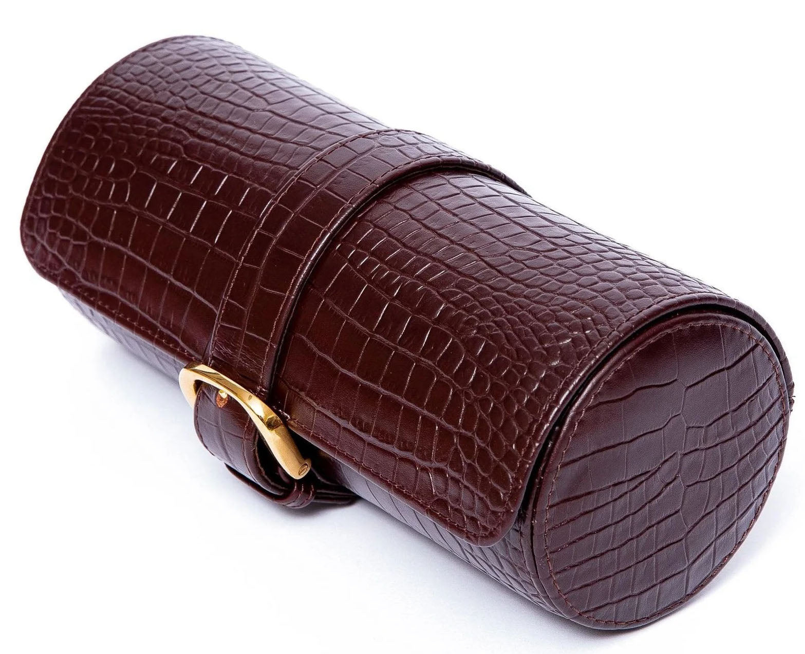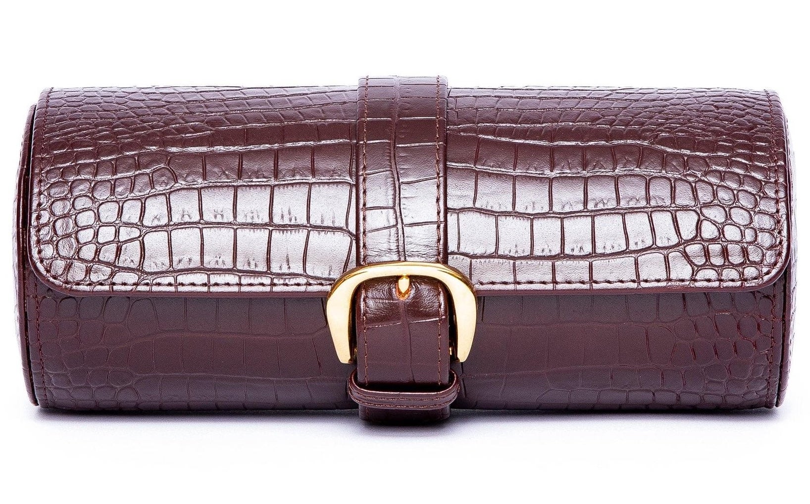 Rapport Watch Roll Brompton 3 Brown Crocodile D165. A luxurious watch roll designed in a crocodile effect leather, to hold three of Rapport fwatches for travel. The watch roll is secured with a chrome buckle and lined in a soft suede, to protect and preserve Rapport timepieces.